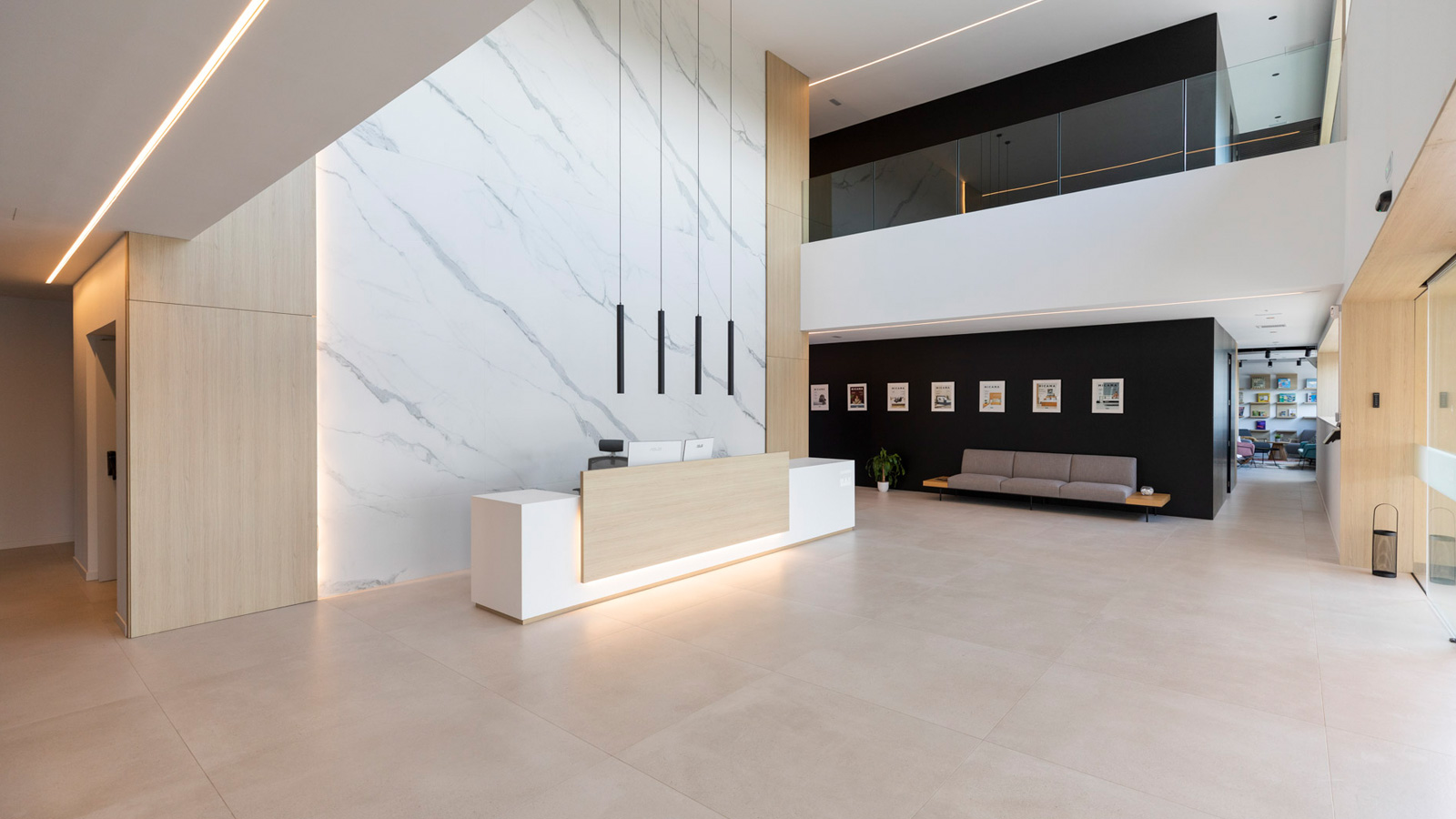 接待櫃台以抗UV的Krion® Lux K•Life 1100人造石製成,背牆則是採用XTONE的Aria White Nature霧面艾瑞亞白,其可垂直順紋的獨特的設計形成一幅巨大的垂直壁畫。大面積的白色基調與兩側的黑色牆壁形成鮮明對比。