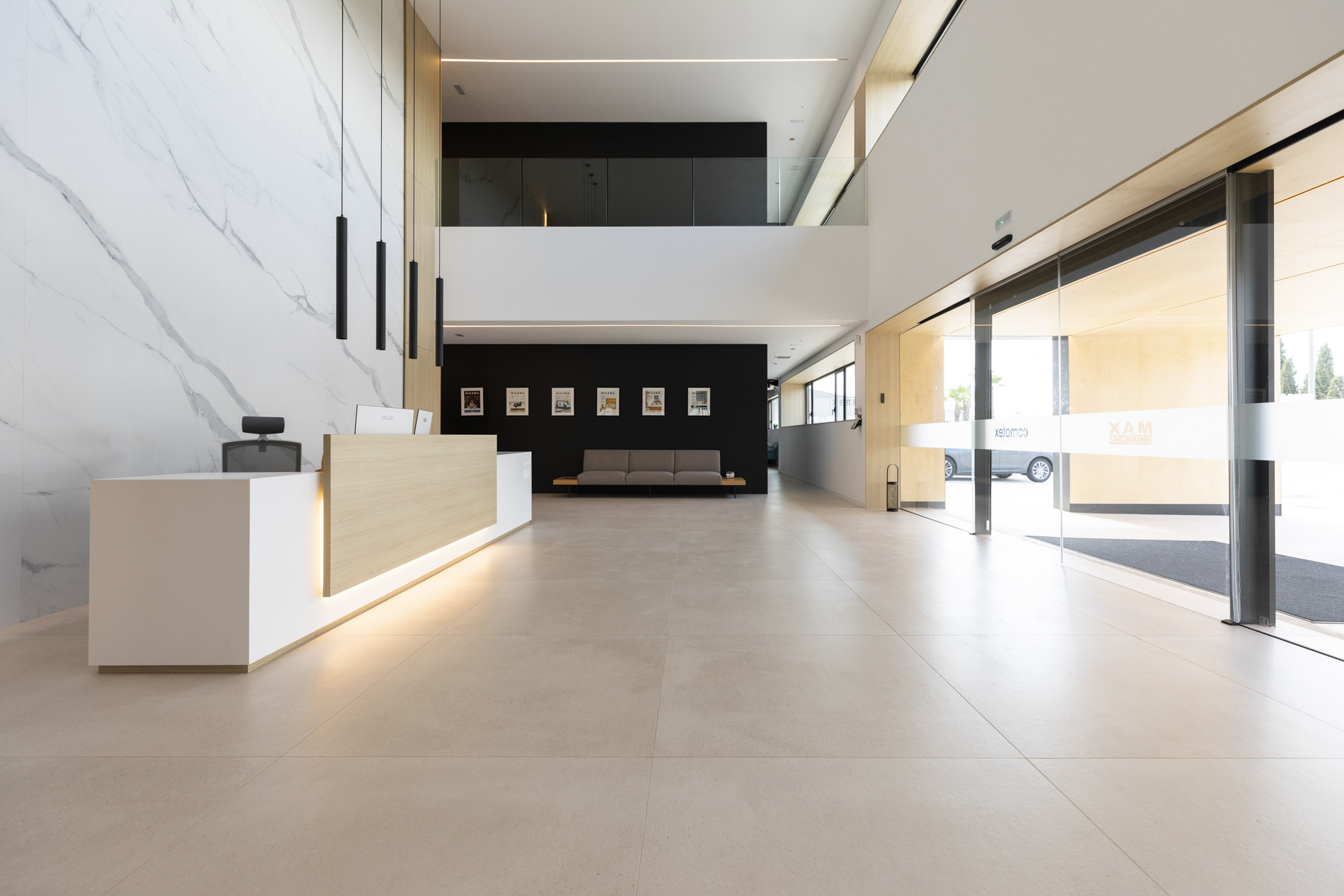 為創造一個溫馨、友善的辦公空間,MaxColchon公司選擇可垂直順紋的ARIA WHITE艾瑞亞白改造位在西班牙瓦倫西亞的總部大廳,該公司通過XTONE仿真的大理石材面感,在挑高的大廳呈現自然靈動、氣勢非凡的空間效果。