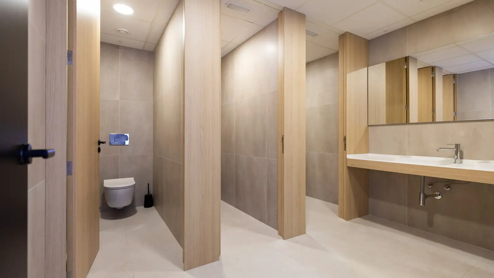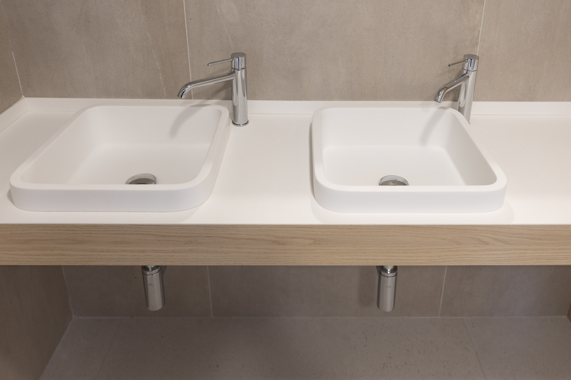 洗手台採用抗UV的KRION® Lux K•Life 1100人造石面盆,搭配石紋質感的牆面和木作隔間提供的慵懶的溫暖感。