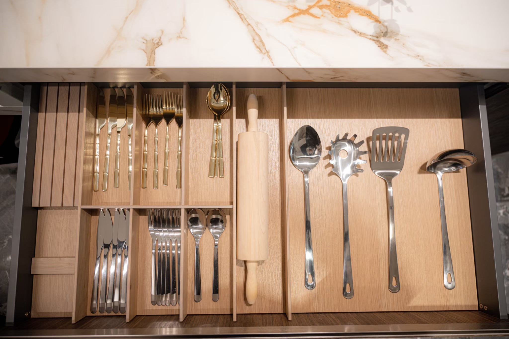 透過與業主多次的溝通,LOAD樂庭設計 張郡庭總監從廚具的配置、動線規畫到檯面、腰牆、壁面材質選用XTONE的CALACATTA GOLD 金卡拉系列輕磁板(6mm)與厚板(12mm),精巧的設計出符合業主所需的廚房空間,更彰顯出女主人的生活品味