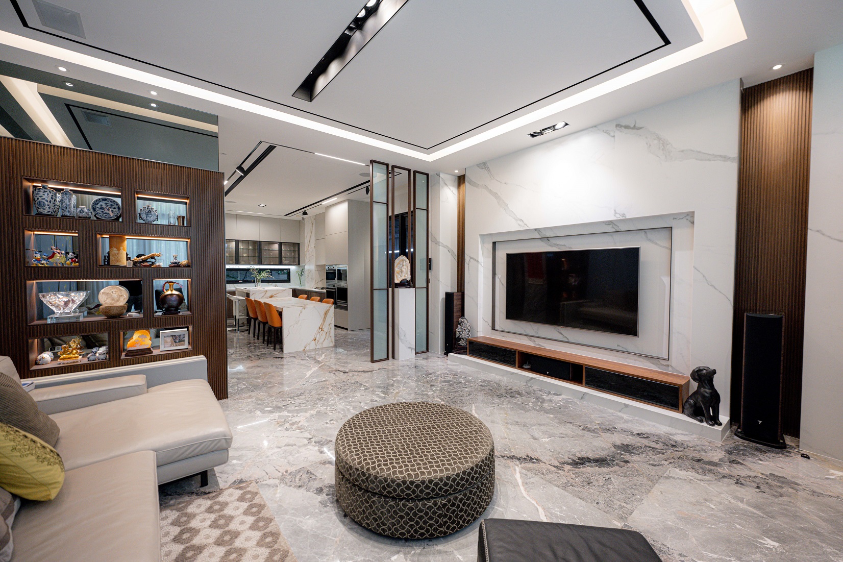電視牆面同樣選擇XTONE的艾瑞亞ARIA WHITE系列霧面輕磁板(6mm),艾瑞亞系列獨特的順紋設計及擬真天然大理石紋理與灰色的天然石材地板形成完美的搭配,設計師透過高低層次的配置勾勒出石材般的厚實感,讓古典、優雅的電視牆成為客廳的視覺焦點