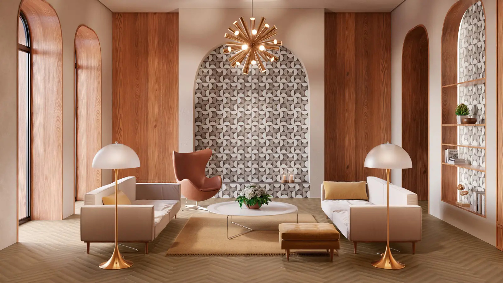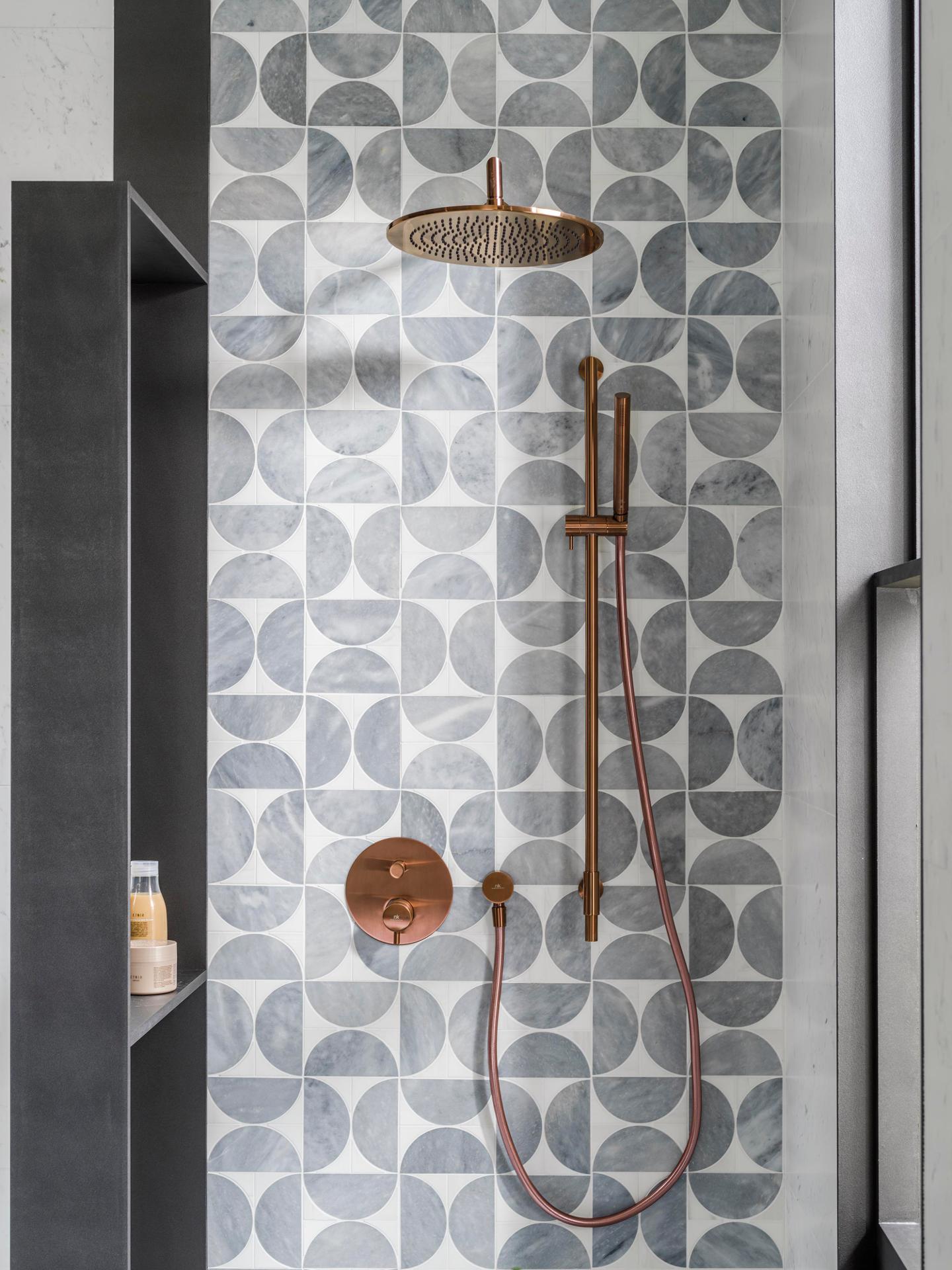Figure 系列中的幾何圖形和花卉圖案創造出馬賽克活潑的動感,例如貝殼(深棕色貝殼和淺灰色貝殼)、螺旋形(深棕色螺旋和淺灰色螺旋)和花朵(粉菊灰)為空間增添色彩、自然和活力