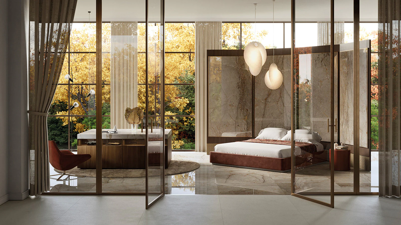 Paonazzo Biondo 流金歲月匯集了大多數冬季色彩。帶有焦糖、鼠尾草和merlot葡萄藤的紋理流瀉在象牙色基底的XTONE輕磁板上,妝點起居室和廚房的牆壁、中島,展現出富麗奢華的貴族氣息。