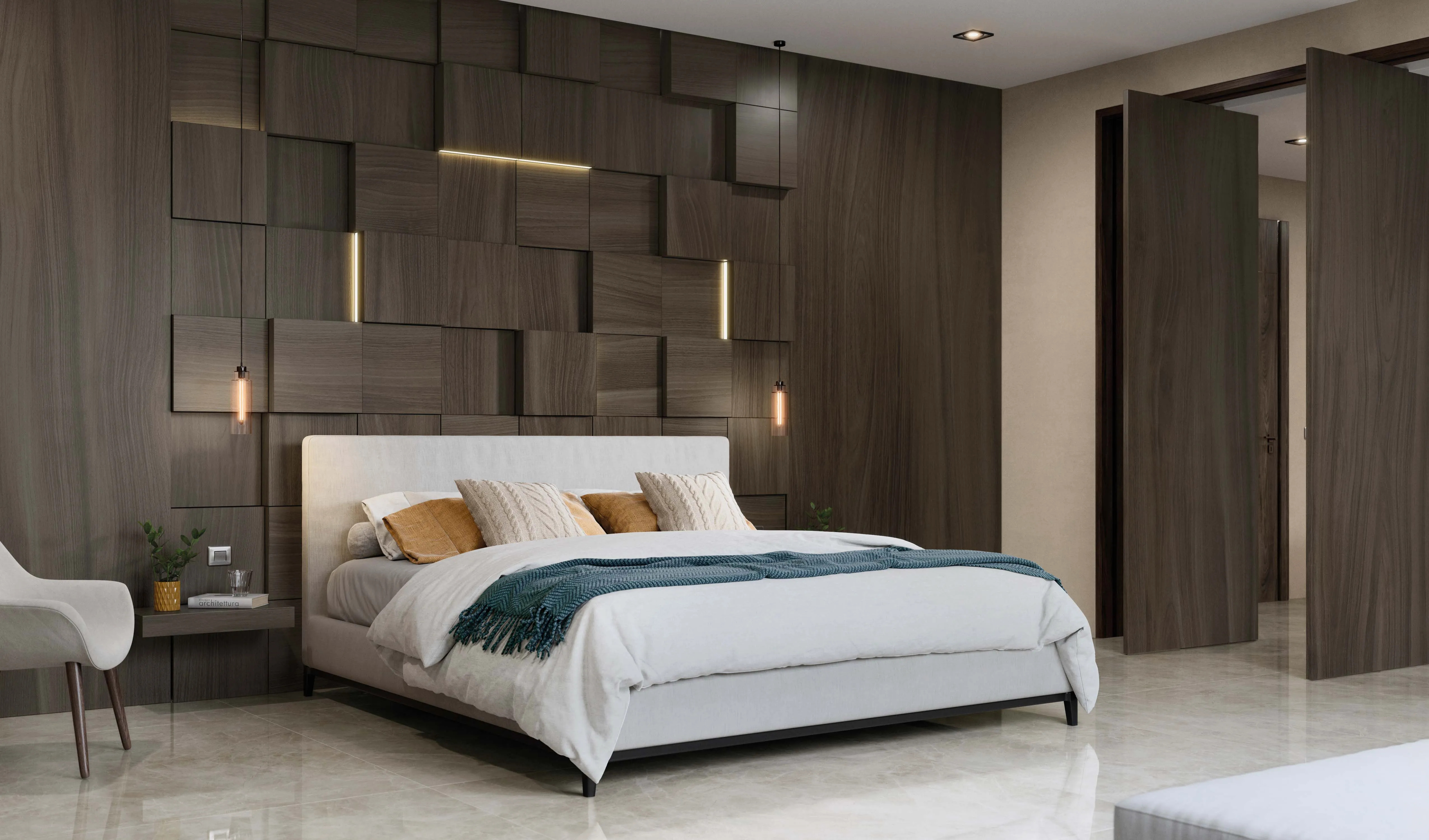 受天然原木的啟發,Ewood Nut 實木核桃黑的深棕色胡桃木紋將原木溫暖、舒適的氛圍帶入室內,搭配家具、床組,營造出精緻、慵懶的暖冬臥室