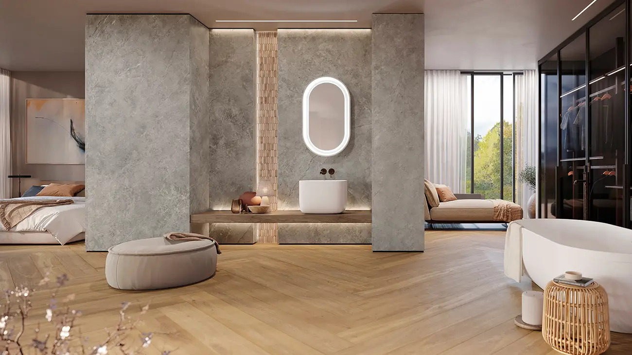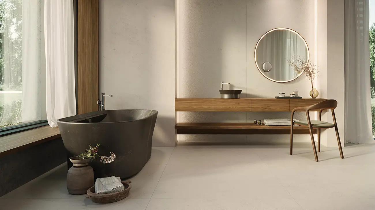 浴室地板上的大尺寸瓷磚為空間帶來了優雅和寬敞的變革感,大規格瓷磚創造出簡潔的線條,並最大限度地減少連接數量,從而形成整潔、現代的外觀;除了超現代的美學之外,這種極簡主義的方法還為浴室地板帶來了精緻的外觀,並且更容易清潔,將為您的浴室帶來感官上的新體驗,充滿時尚感。