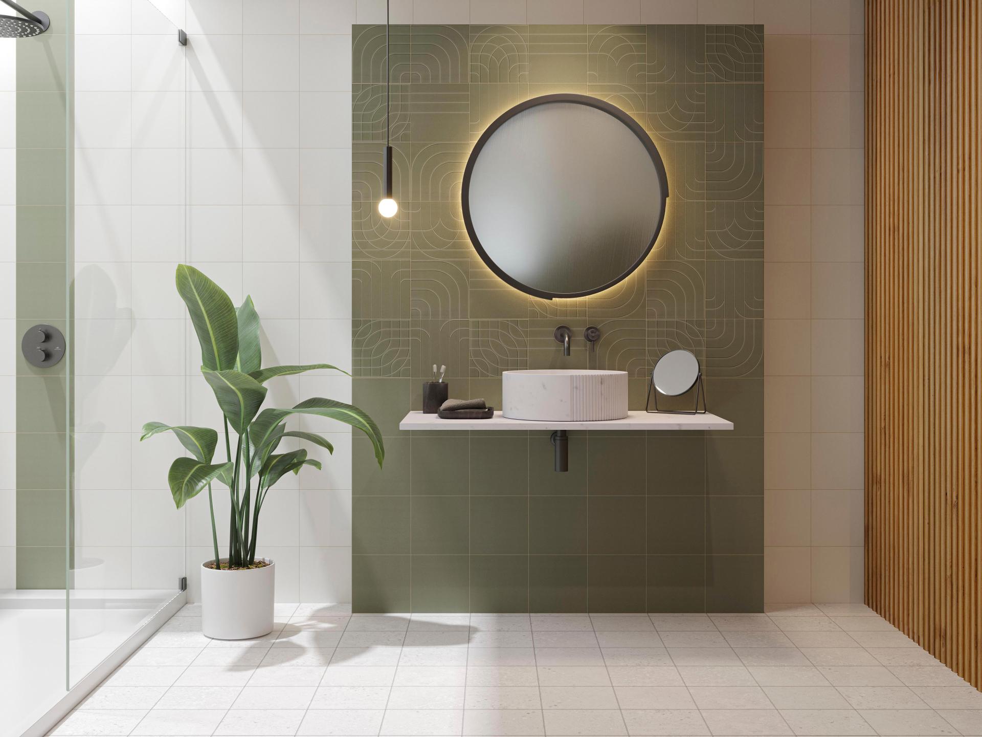 天然木紋浴室地板和Fiori di Bosco 費洛迪系列牆面呈現清新自然的感受