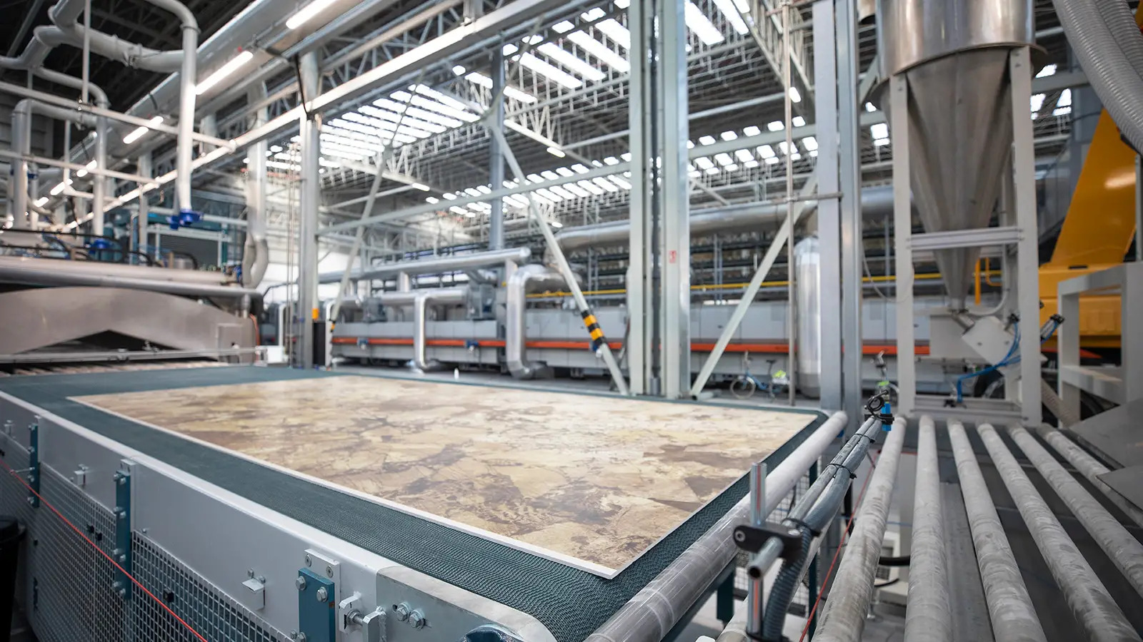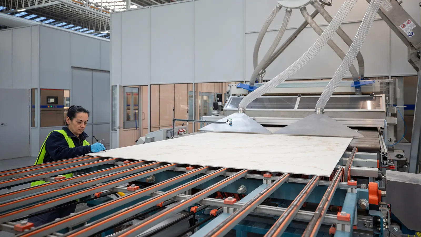 長達250m的全自動窯爐是目前全歐洲最長的窯線,從進料、裁切、加工一氣呵成,並配備了數位檢測系統,每片板材都經過單獨分檢,以確保每片產品都能符合生產標準與要求。檢查合格的板材將進入後期製作區,後製區採用全自動的乾式的自動打磨機、自動背網黏合機和一台拋光機,以滿足不同系列產品的表面處理需求。