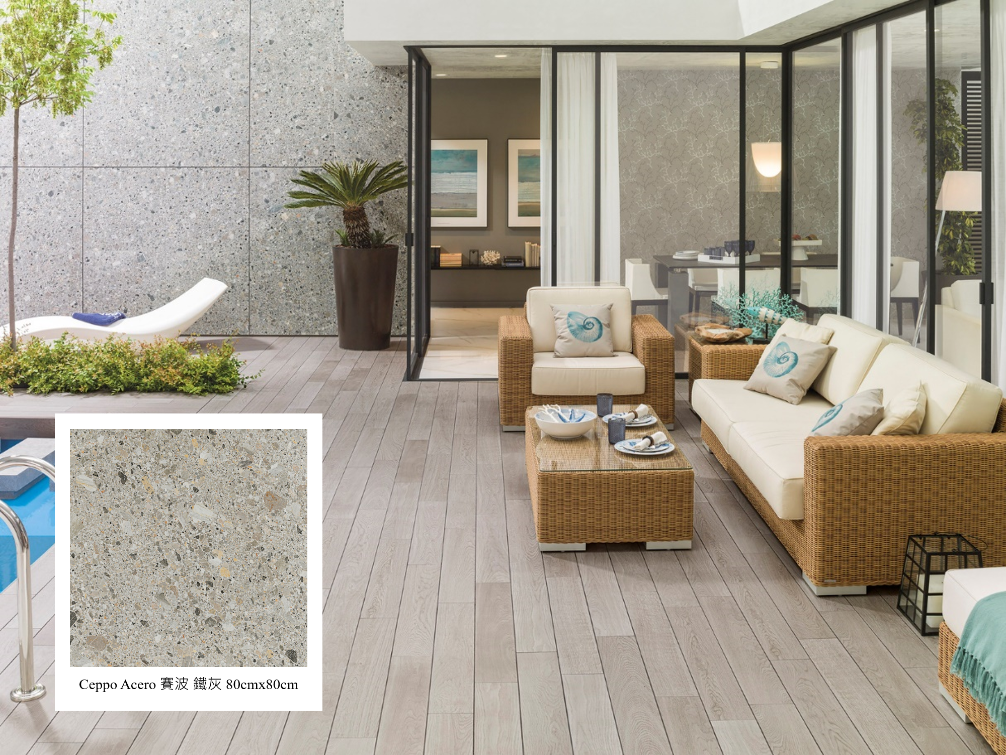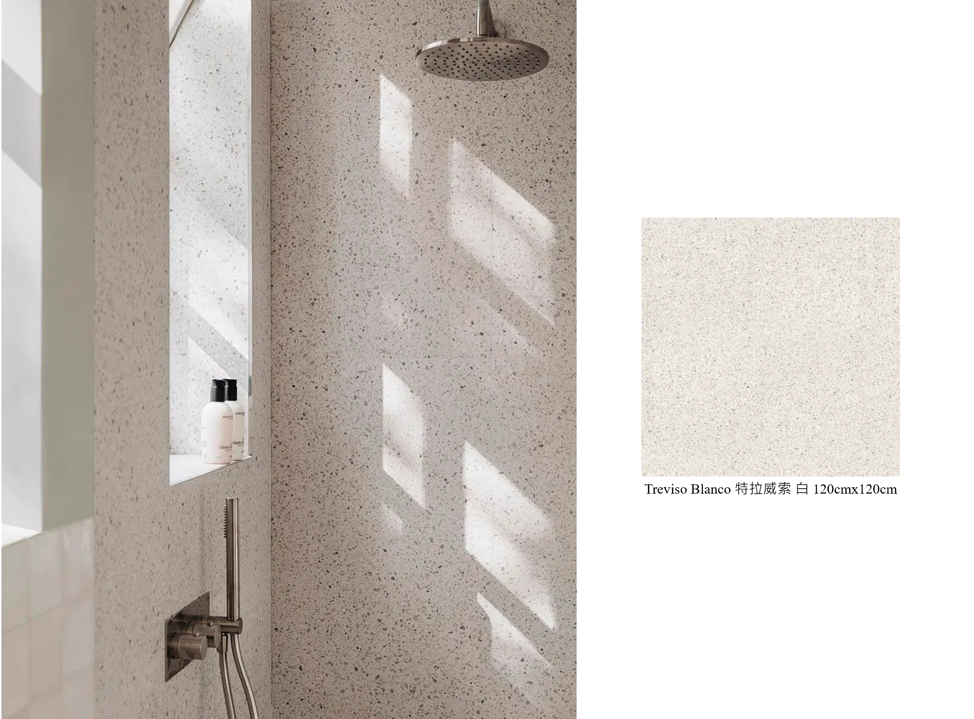 新一代的仿水磨石磁磚,它與傳統水磨石具有相同的美感,極具現代裝飾性,但價格實惠且不會造成龜裂及石子脫落。水磨石磁磚憑藉其獨特的質地、顏色和耐用性,非常適合在走廊、浴室、廚房、起居區甚至戶外空間使用