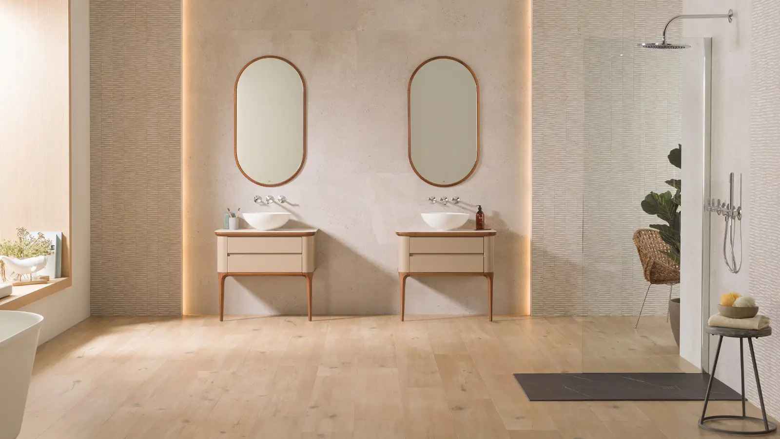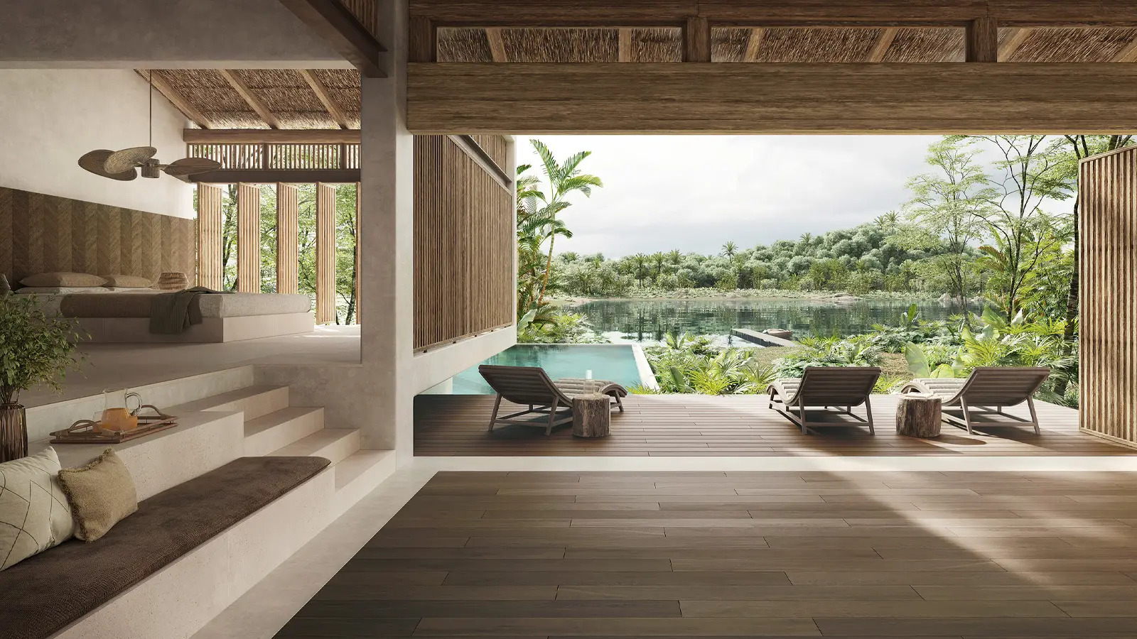 溫暖簡約風格的主要原則之一是使用天然材料,實木便是常見的空間裝飾運用材料。但實木怕濕氣、蟲蛀且不易保養,特別在地板的鋪貼上漸漸採用了木紋磚,紋理細緻擬真的木紋磚取代了天然實木的運用,並保留不同樹種木紋的獨創性。PORCELANOSA的各式木紋磚提供溫暖簡約的感受,讓心境自然放鬆
