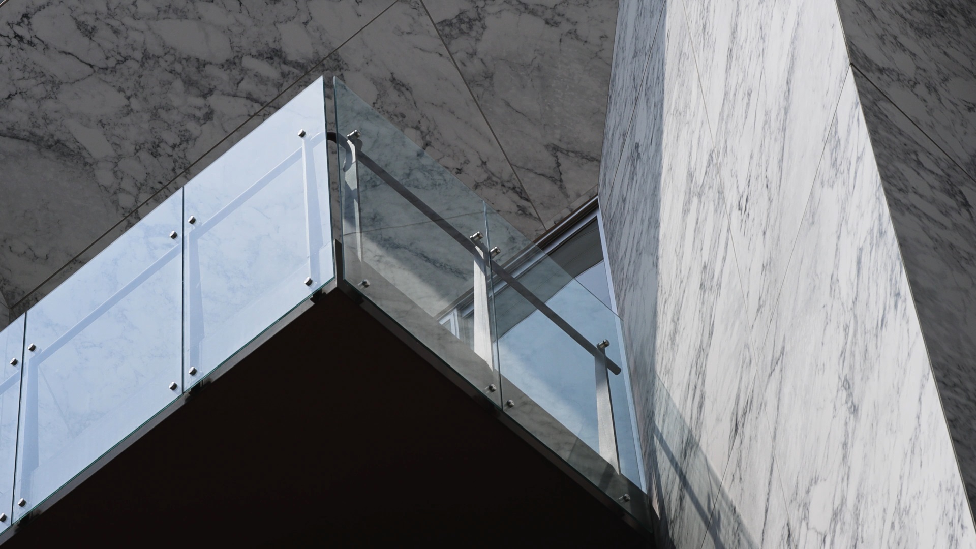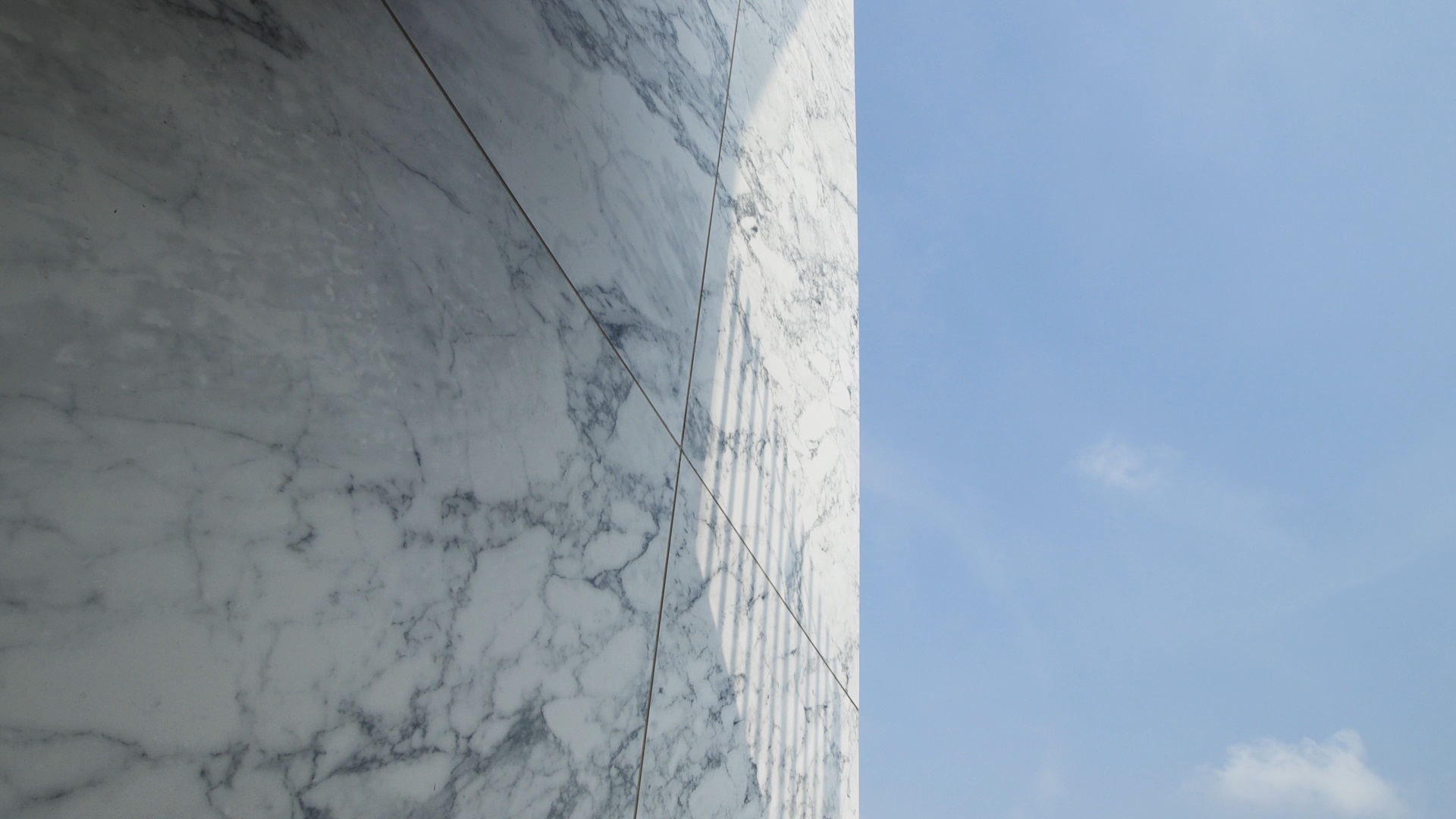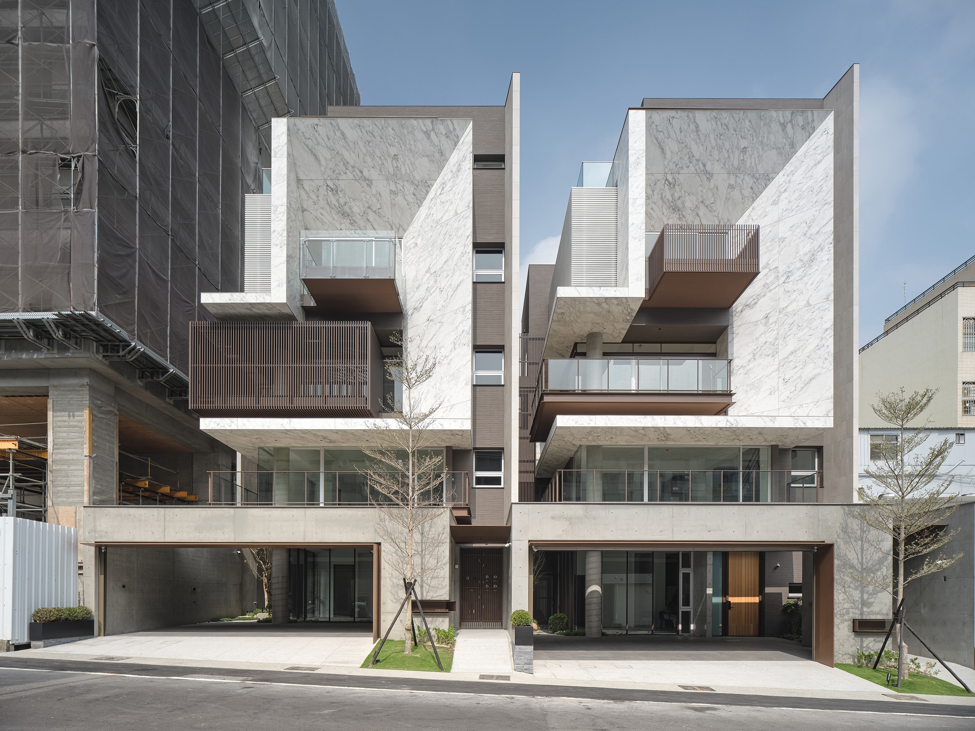 不同於台灣常見的二丁掛、金屬帷幕或花崗石材…等外牆材料,「誠美無二」為打造具有大理石紋路的獨特立面,特別選用「西班牙寶瓷蘭XTONE艾克石」,解決傳統白色大理石受限於重量、吸水率、易汙染等因素無法施作外牆的限制,XTONE艾克石接縫少、可接續紋路的磅礡效果,甚至能鋪設天花板,讓整個立面設計往裡延伸,天地壁結構與設計連成一氣。