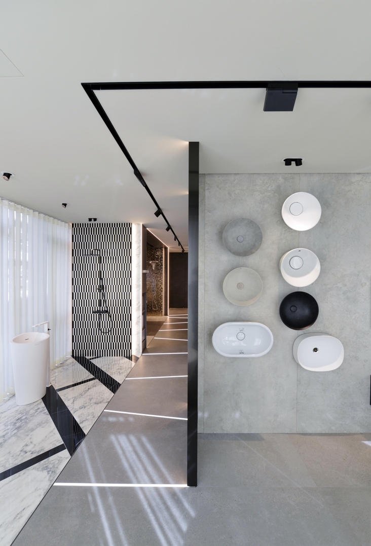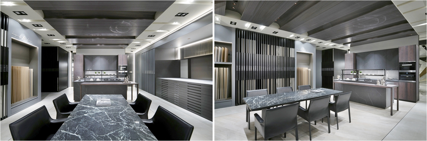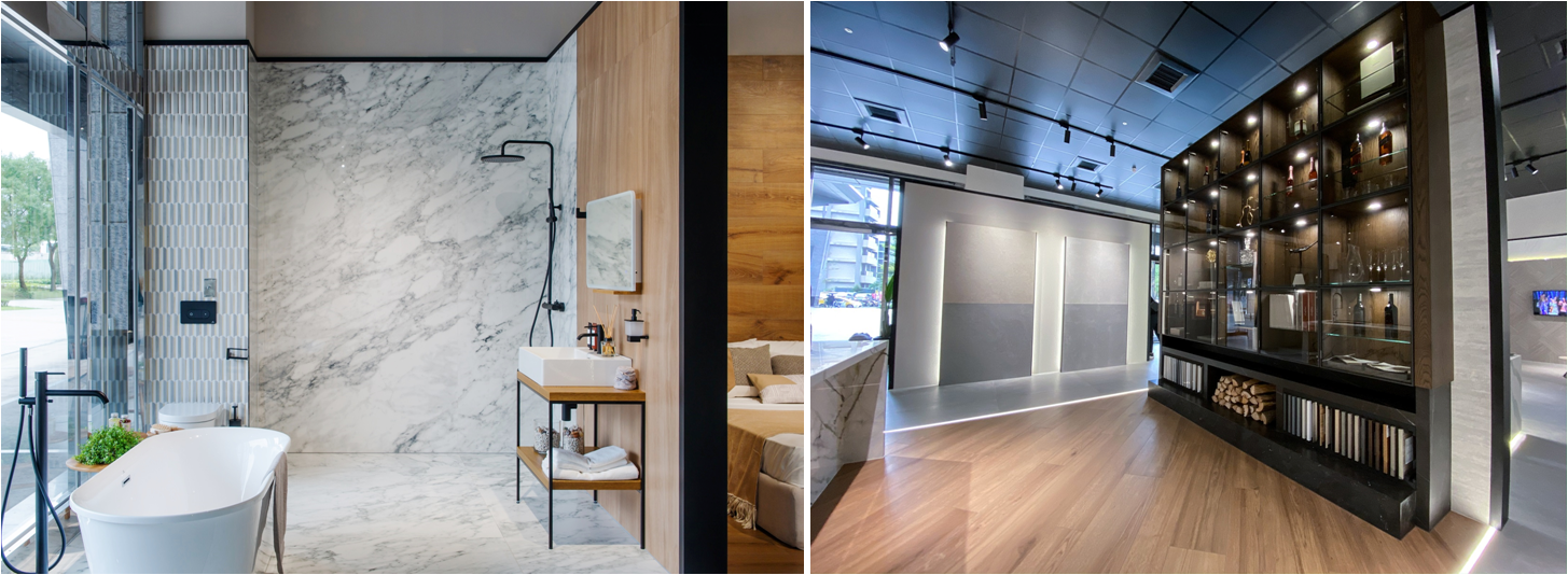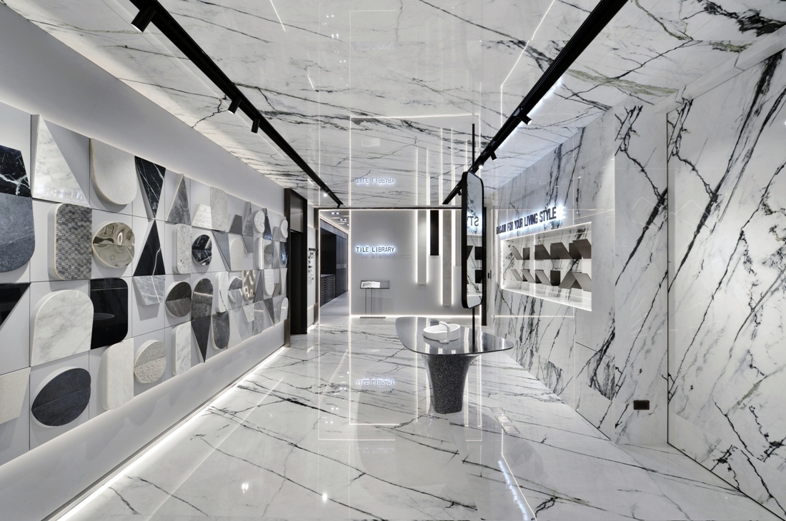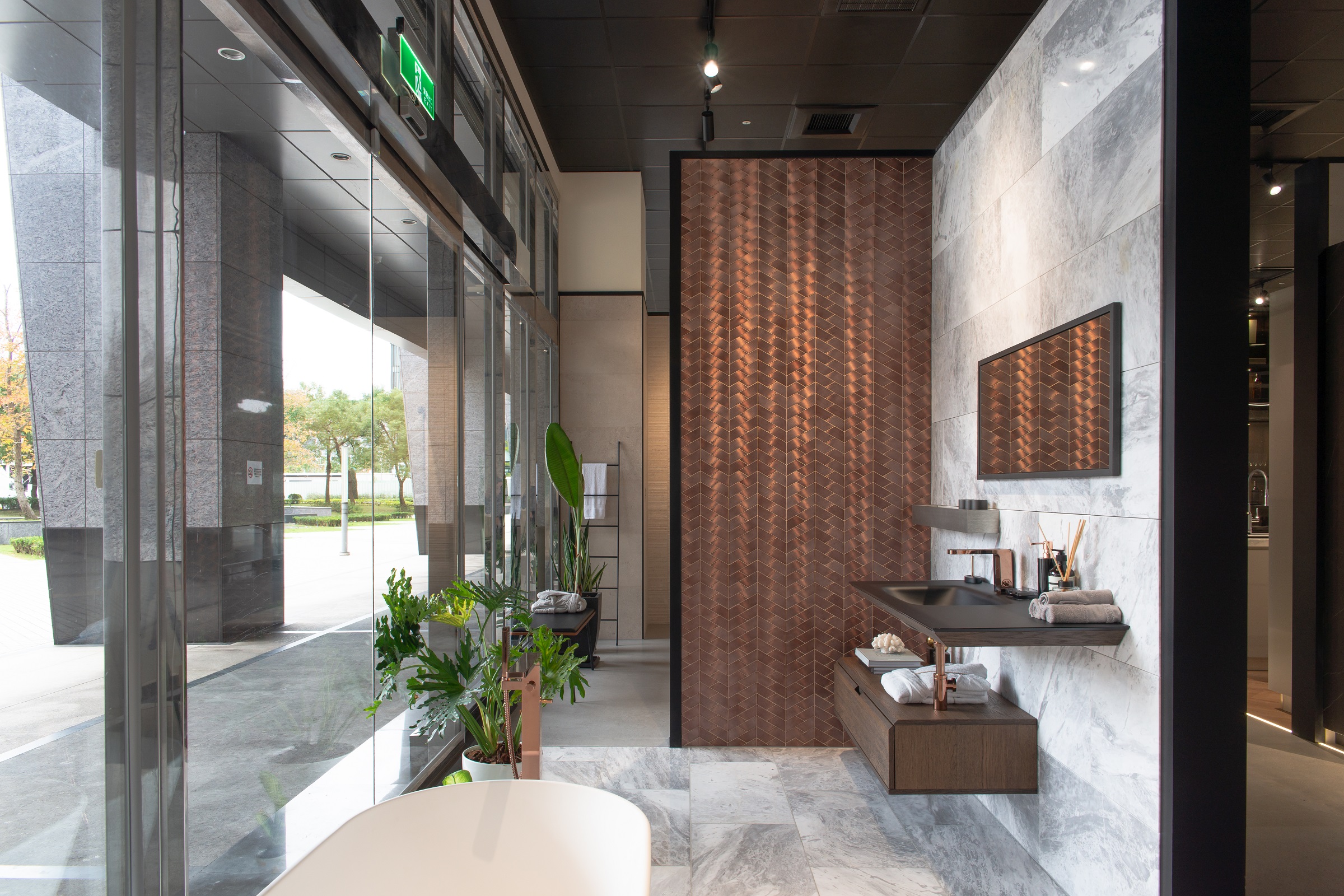 位在台中七期的台中旗艦館,以溫馨的「家」為設計理念打造100坪的展示空間,營造出「溫暖、關心與愛」的展演氛圍。整體空間劃分「接待大廳」、「生活場域」及「磁磚圖書館」三個區域,結合多元建材的活用與設定下,刻劃出獨一無二的專屬樣貌