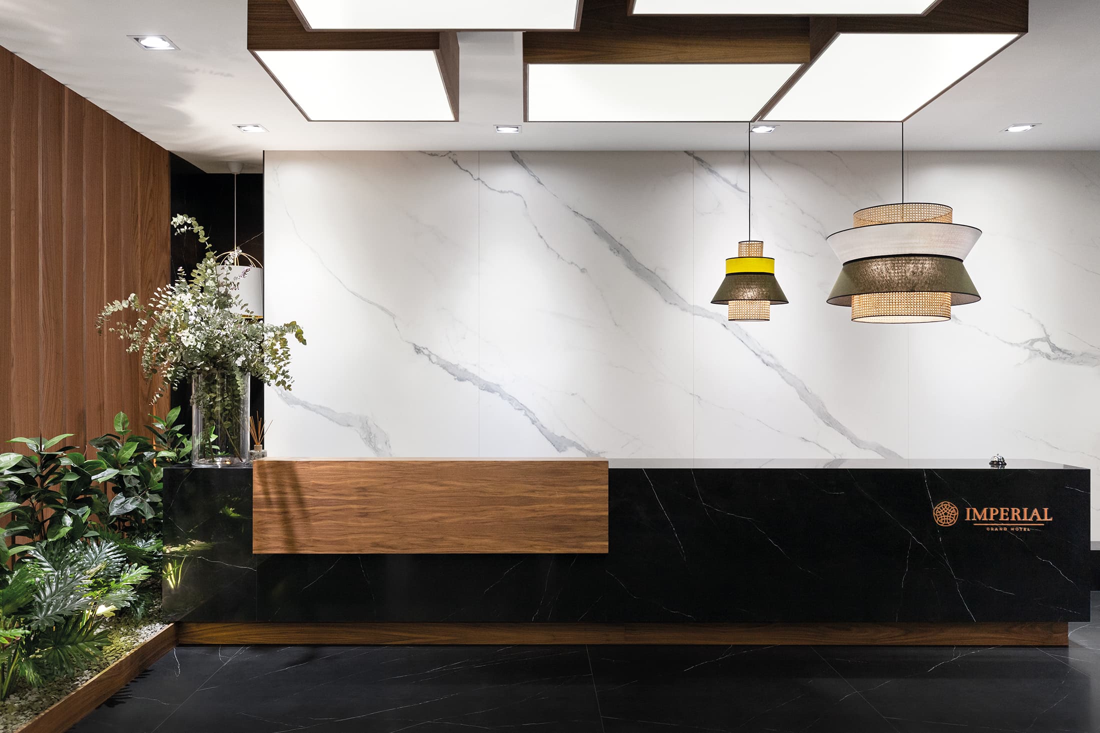 一進入接待大廳,設計師將XTONE的Calacatta Green綠卡拉輕磁板串連起天地壁面,凸顯了輕磁板較石材輕盈,可鋪貼於天花板上的突破技法;仿真的印刷技術烘托鮮明的綠色線條,透過超大尺寸規格拼接,在鋁擠光帶的延伸下,讓材料的美學特質於空間盡情詮釋,彰顯磅礡氣勢