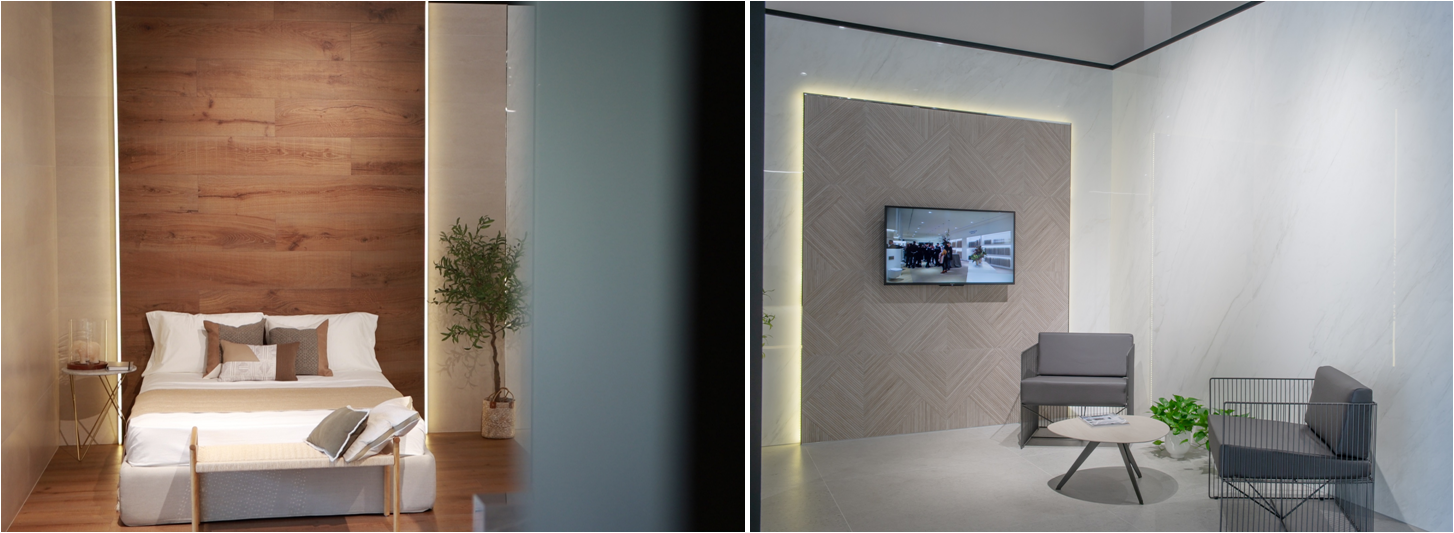 此外,「水平連續順紋」、「垂直連續順紋」的拼接技法,創造出連續紋路與一體成型的視覺感,成為業界最領先技術,運用拼接方式的創新,加上拼貼縫隙小,可打造出比一般磁磚大3倍的面積,運用在豪宅或大廳公設可創造出恢弘的器度,突破石材無法營造出的視覺震撼效果