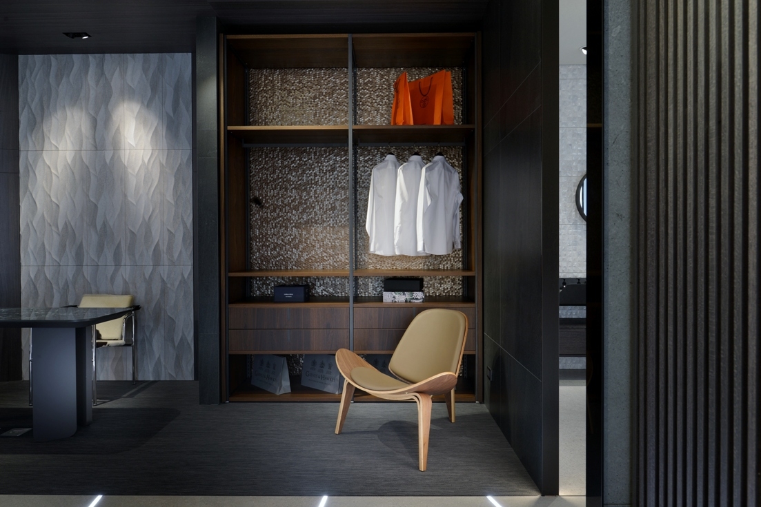 以居家場域為區隔,從廚房的中島吧檯到高端壁櫃、北歐風極簡寢室、輕奢質感的衛浴空間及臥室,將建材的質感肌理、色澤配置於現場一一演示