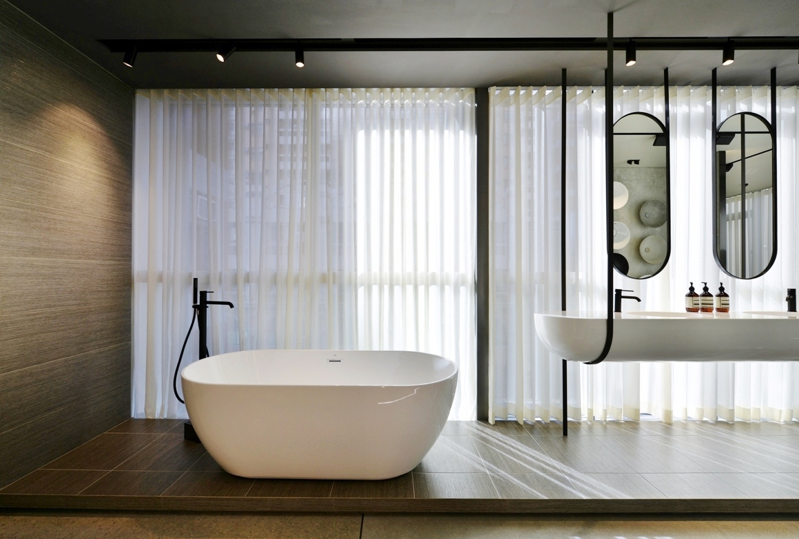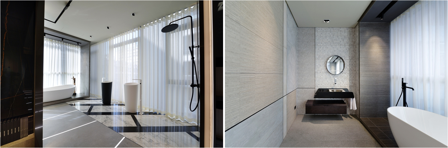 以大面積落地窗為畫框,右側手做弧形流線的Krion抗UV人造石洗手台,對應左側圓潤身形的浴缸,調和出靜謐、溫潤與圓滿概念