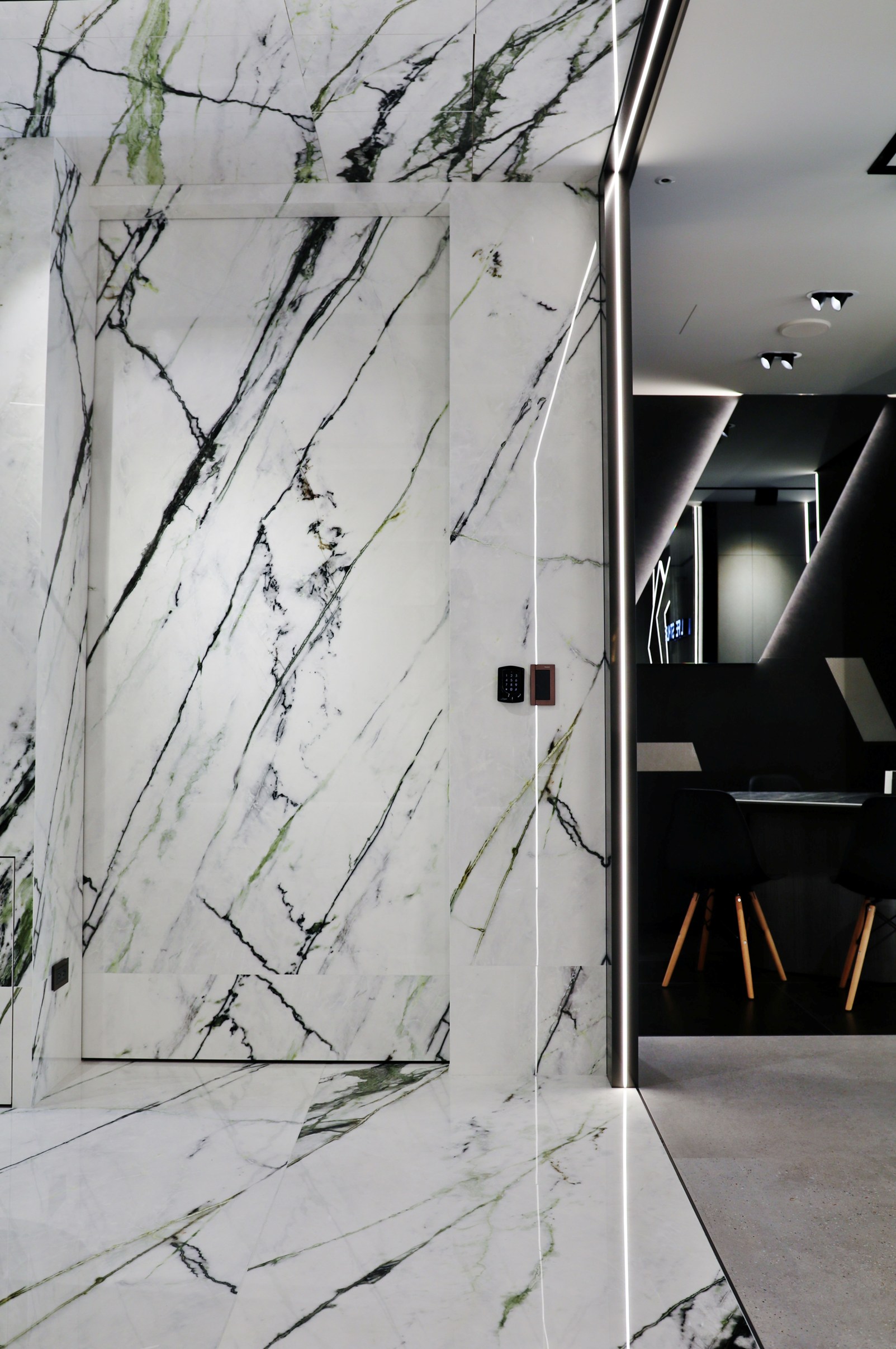 串連起天地壁面的 Calacatta Green 綠卡拉輕磁板>>>