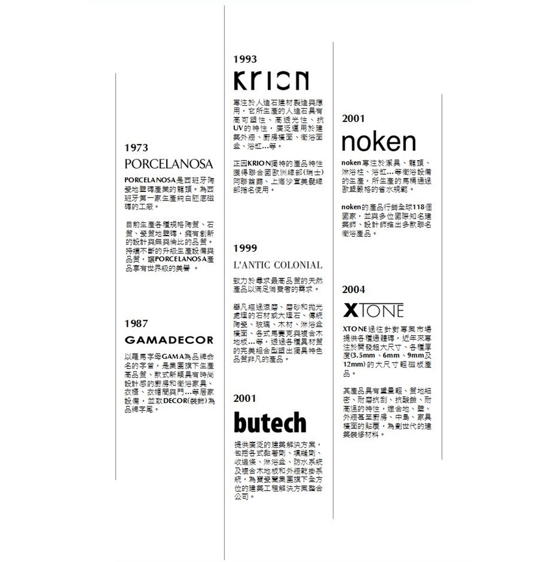 PORCELANOSA寶瓷蘭由單一「磁磚」生產擴及到廚房、衛浴、輕磁板、抗UV人造石..等多元的建材服務。2020年台灣宥鋐貿易獨家代理PORCELANOSA Grupo寶瓷蘭旗下7大品牌,提供歐洲最新居家流行建材、設計趨勢與建築工程整合性服務給台灣的消費大眾!