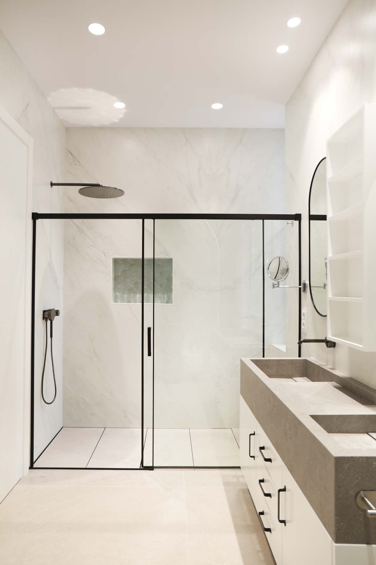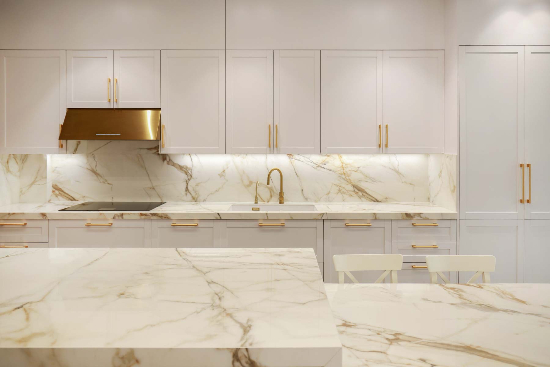 從室外到室內,空間皆選用 Porcelanosa 各系列建材精心搭配。地坪鋪設石材質感的 River 長河系列與 Adda 艾達系列;牆面則採用白色大理石紋薄板 Glem White 格林白與壁磚 Japan 大和系列,形塑出俐落連貫的視覺延伸。檯面部分則選用 XTONE 艾克石白色底蘊勾勒金色紋理的 Calacatta Gold 金卡拉厚板磚,在色調上一致呼應,並藉由紋理細節提升整體質感與空間層次,讓日常接觸的每一面都充滿溫潤與品味。