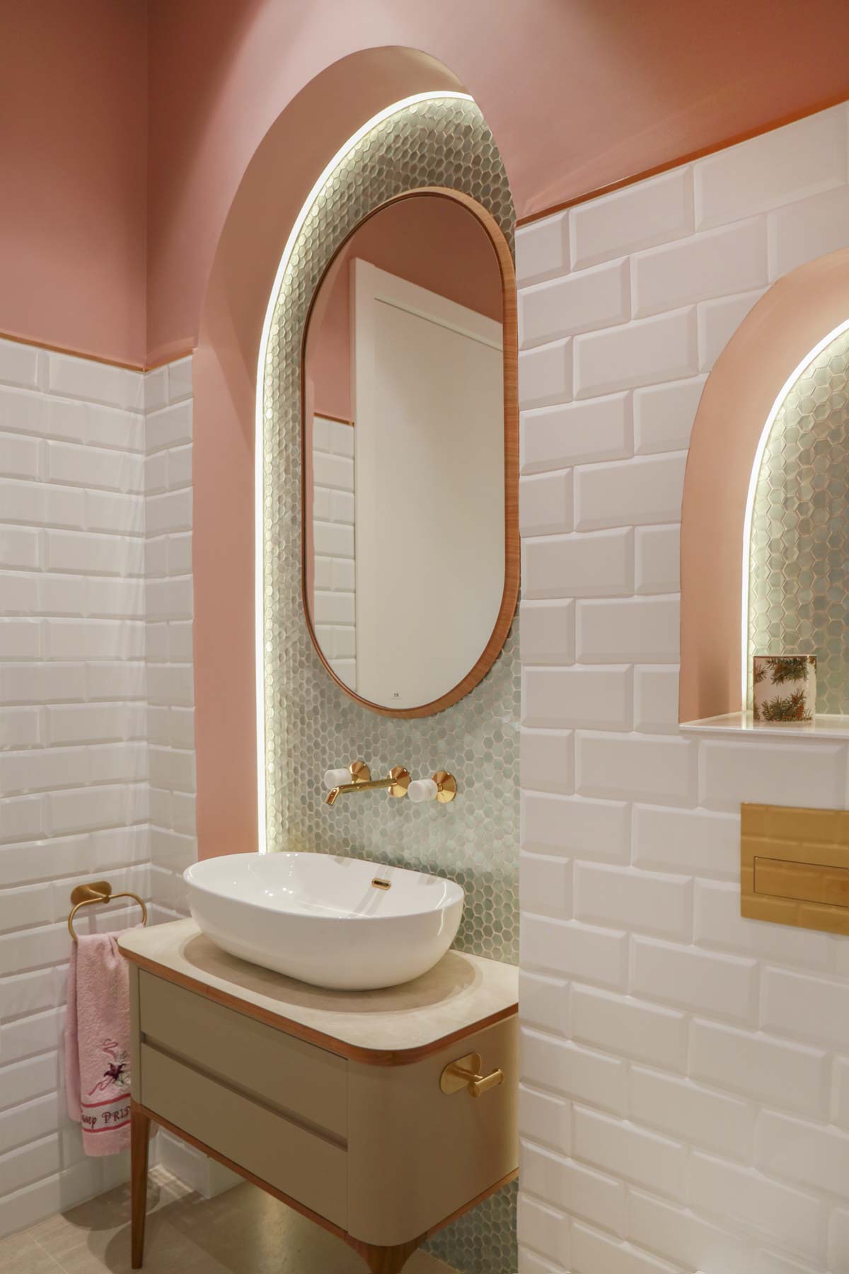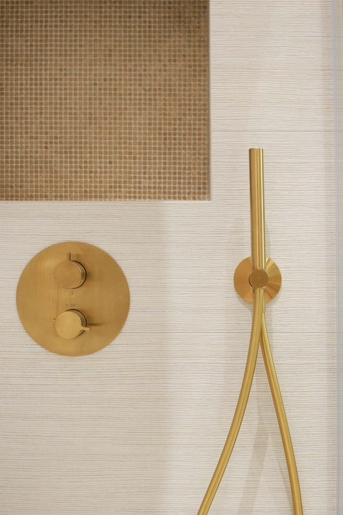 馬賽克磚的應用則為空間注入靈動氣息。局部以帶有金屬感的馬賽克磚點綴,成為材質間的過渡與視覺焦點,不僅打破單一材質的節奏,也展現 Porcelanosa 對細節設計的極致追求。