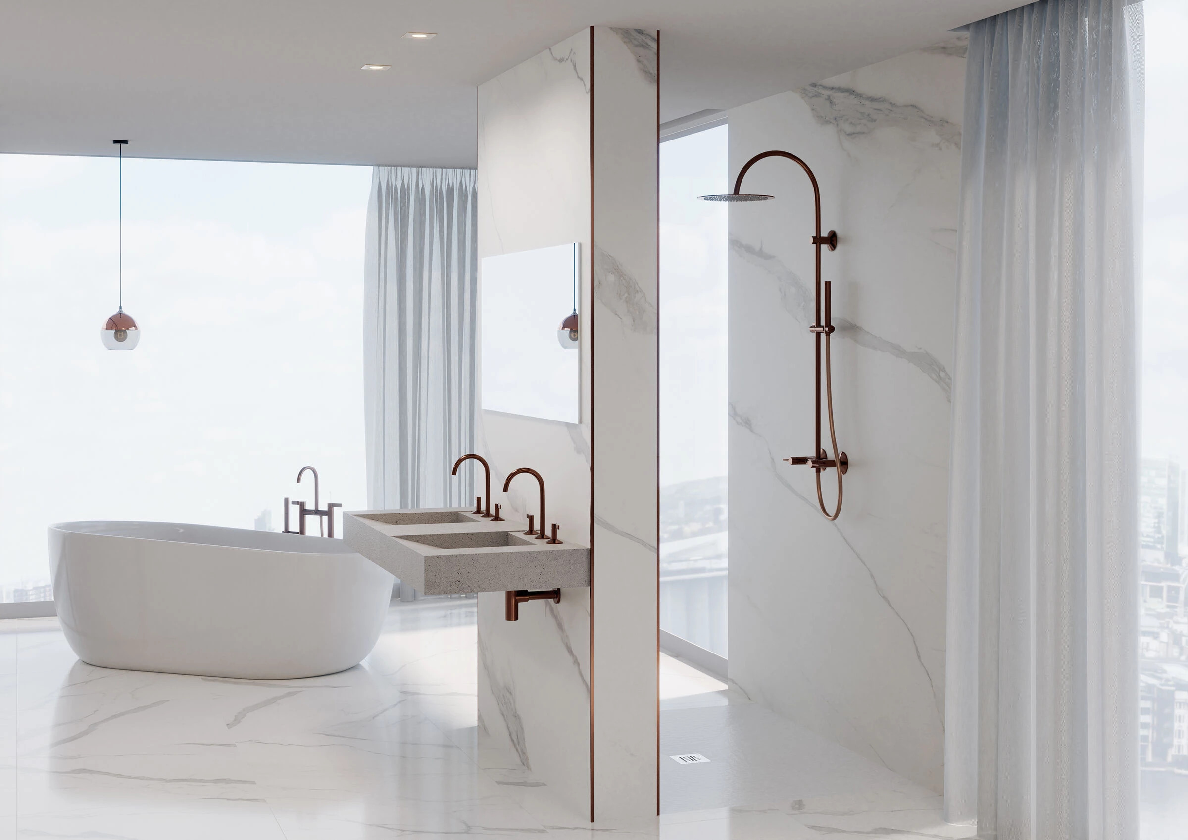 此外,借助 Finish Studio,還可以選擇鍍鉻、白色、黑色、銅色和拉絲金色飾面,以搭配任何裝飾風格的浴室空間、設備與家具。