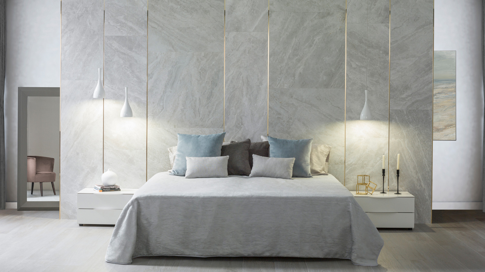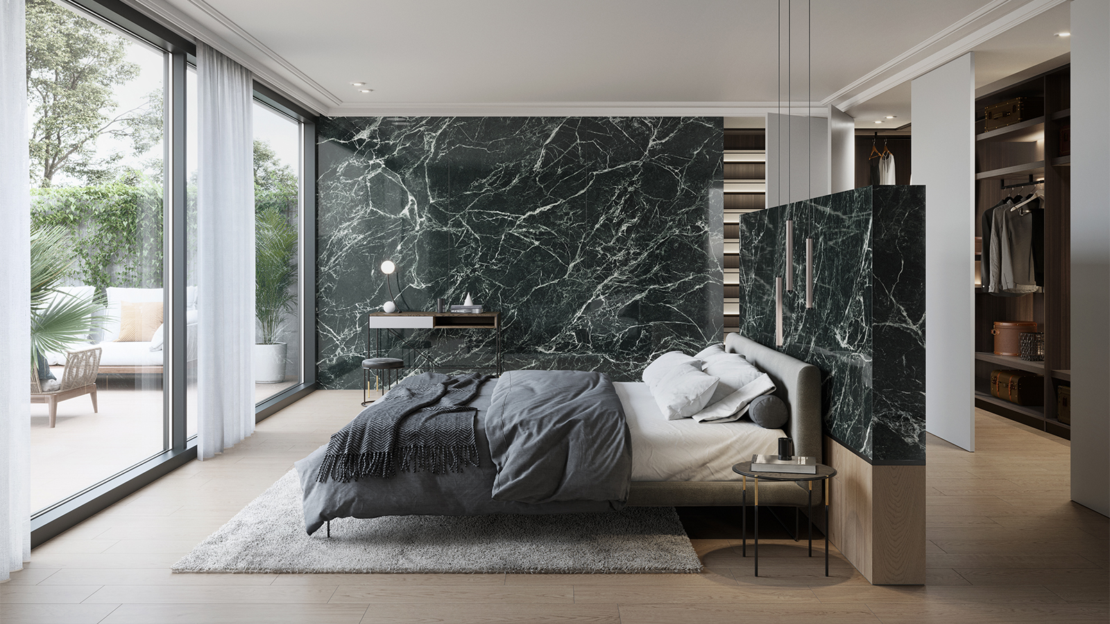 要是不喜歡極簡風的單色美學,您可以嘗試有台灣國寶花蓮玉美稱的Alpi Verde蛇紋綠XTONE輕磁板或是即將推出的Marquina Black黑白根XTONE輕磁板。它們取材自天然大理石優質的紋路,運用在床頭板或臥室牆壁的背牆上可以與灰色紡織品、北歐風格的桌子和圓柱形檯燈…等相映成趣。