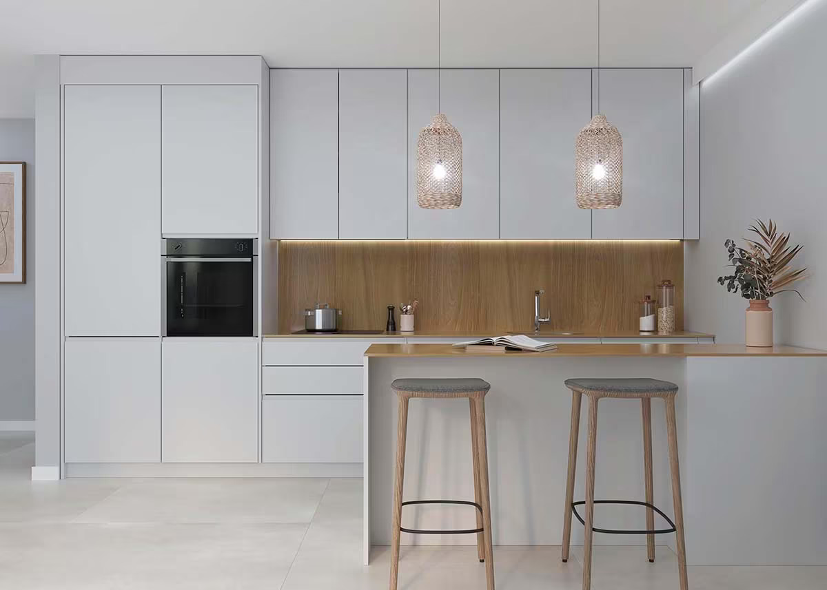 木紋與優雅的白色櫥櫃顯得相得益彰,無論是採用亮面還是啞光面的廚具面板,木紋與白色櫥櫃的優雅組合適合在北歐風、鄉村風、極簡和現代…等各種不同型態的廚房。