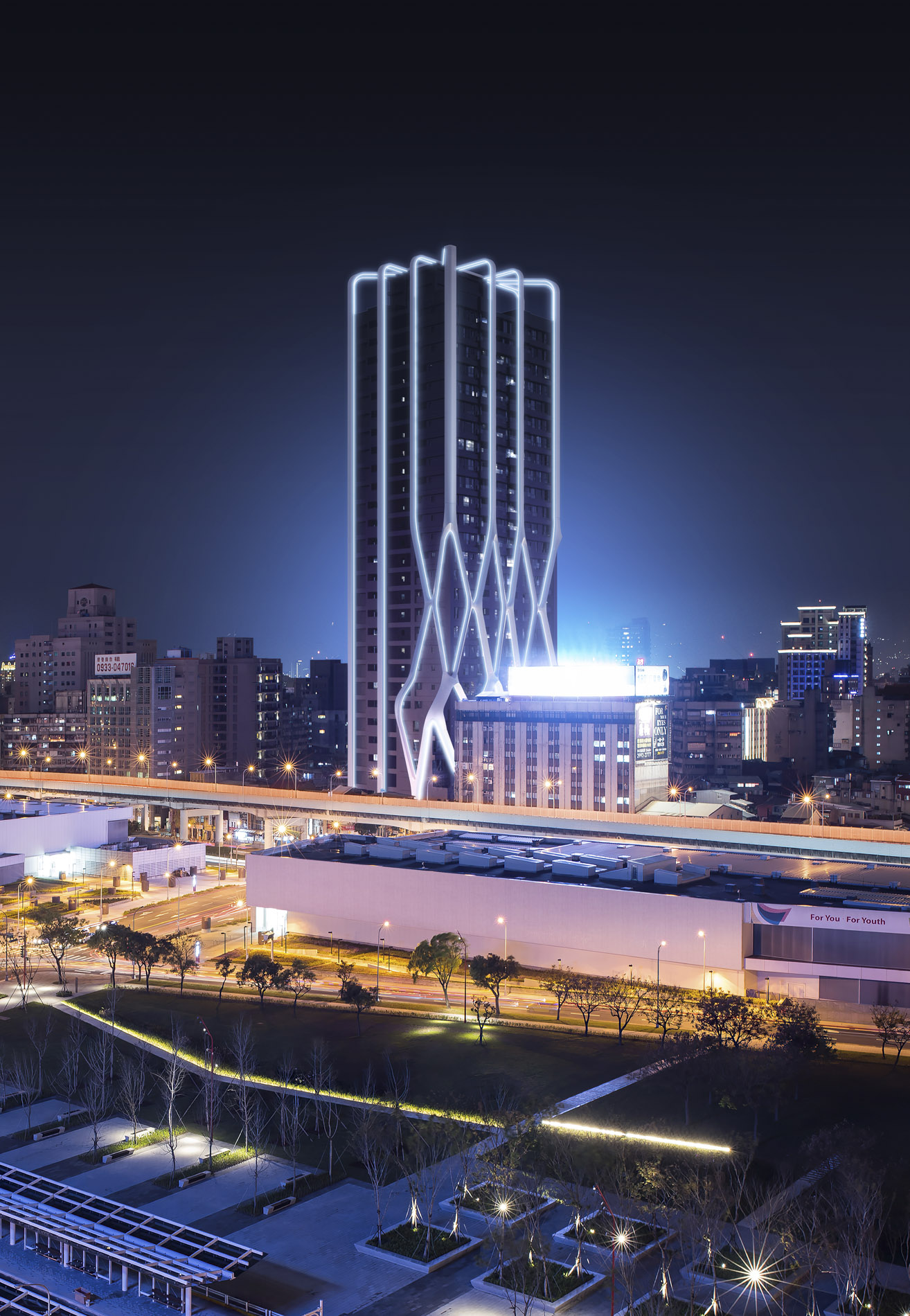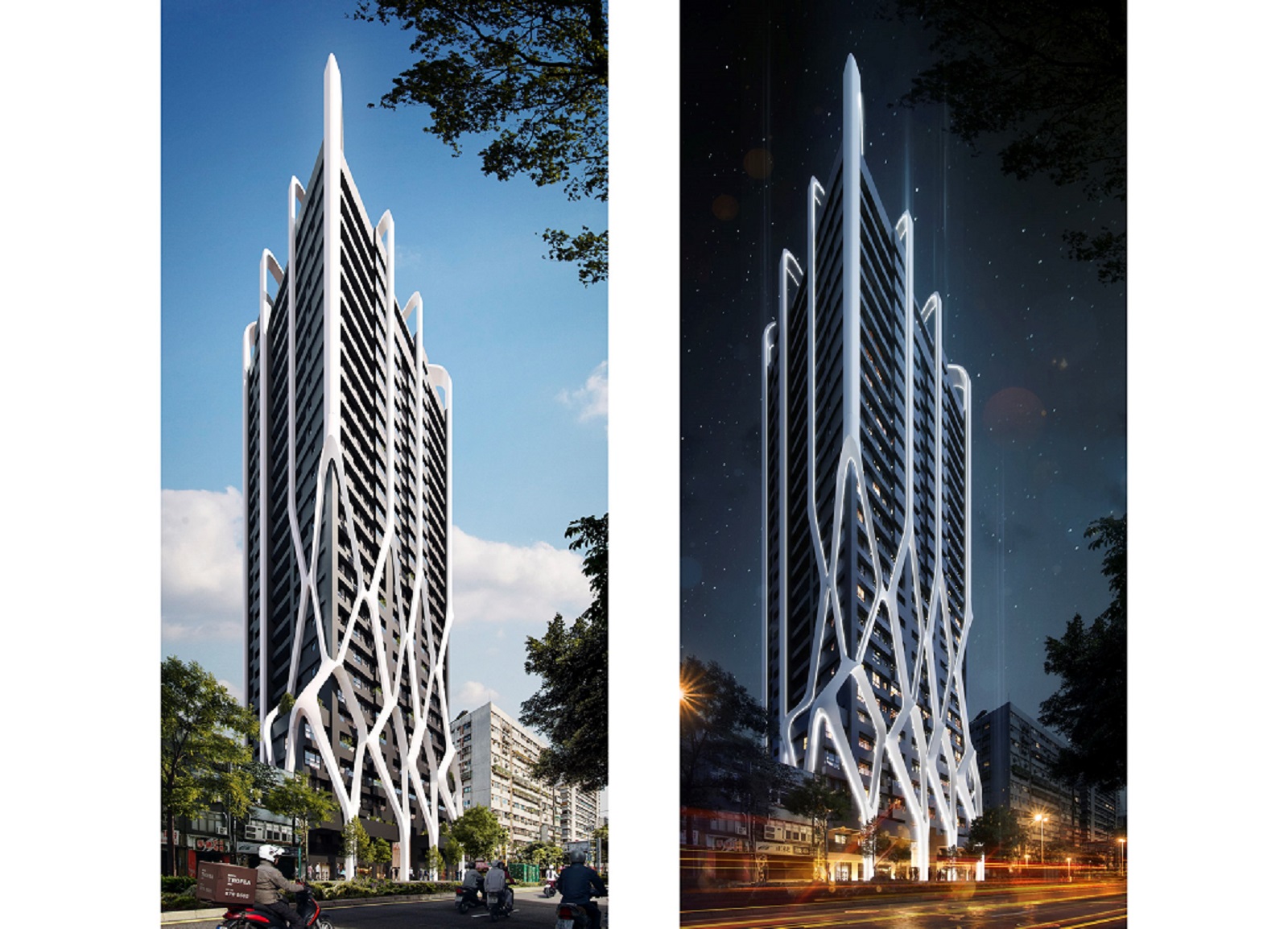 「The Crown國王雙子星」全案規劃由西班牙ON-A建築師事務所團隊運用BIM參數化立面設計概念,結合CROWN皇冠意象,打造樓高28層,總高112公尺的當代幾何美學地標,與美國SOM設計的台北雙星BOT案遙相呼應。