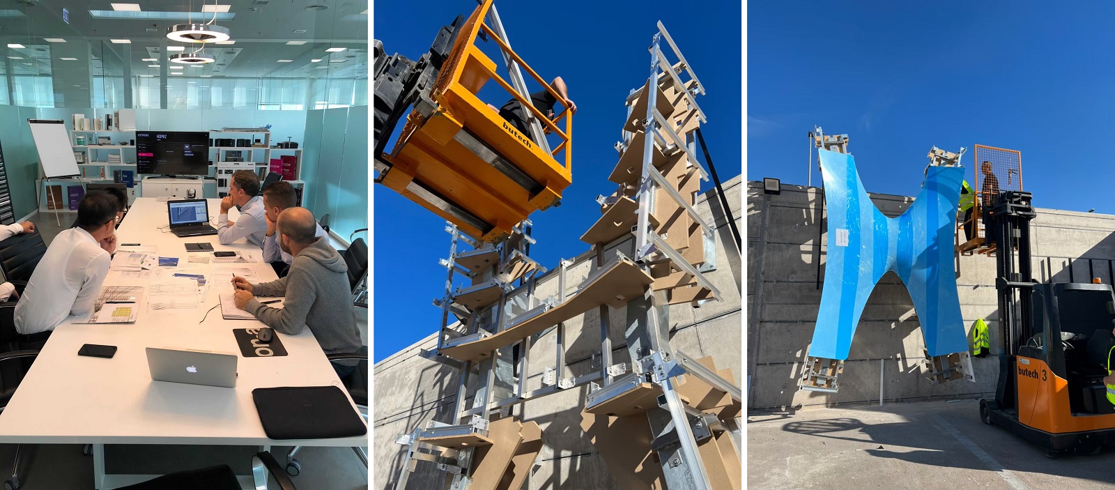 這引人注目的外部結構是由250個節點模組(直型、對角型和角型)及各種不同的模具組立而成。為了確保該專案的成功台灣宥鋐貿易特別邀請國礎建設工程團隊一同至西班牙PORCELANOSA Grupo總部,由Butech專業團隊建造了一個具有雙曲線(4 m x 4.5 m)節點件的1:1比例原型。其立面內部結構、固定系統和預製模組的設計均由Butech的建築師和立面工程師精心設計,並由國礎建設工程人員逐一確認符合建築圖面設計需求。
