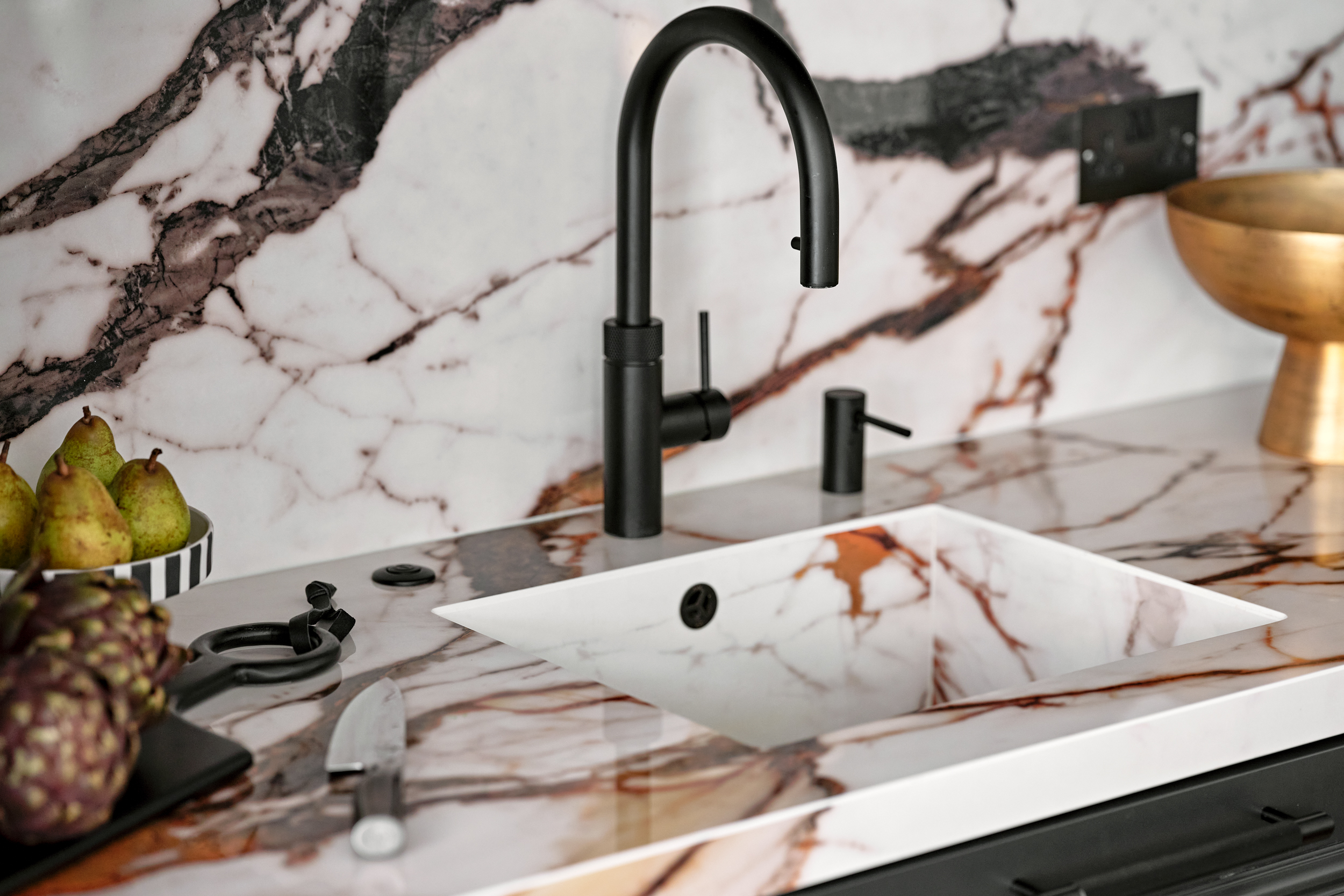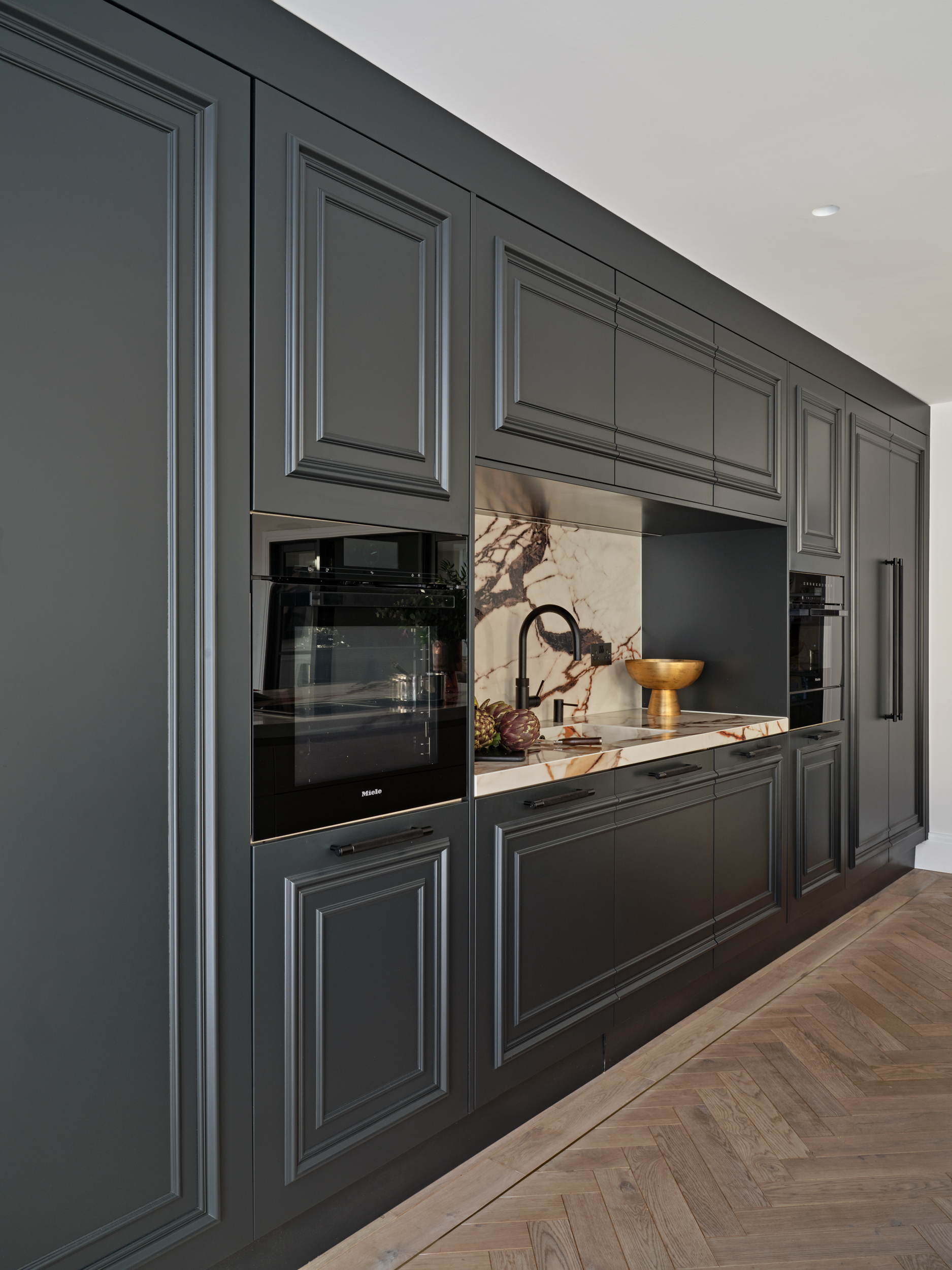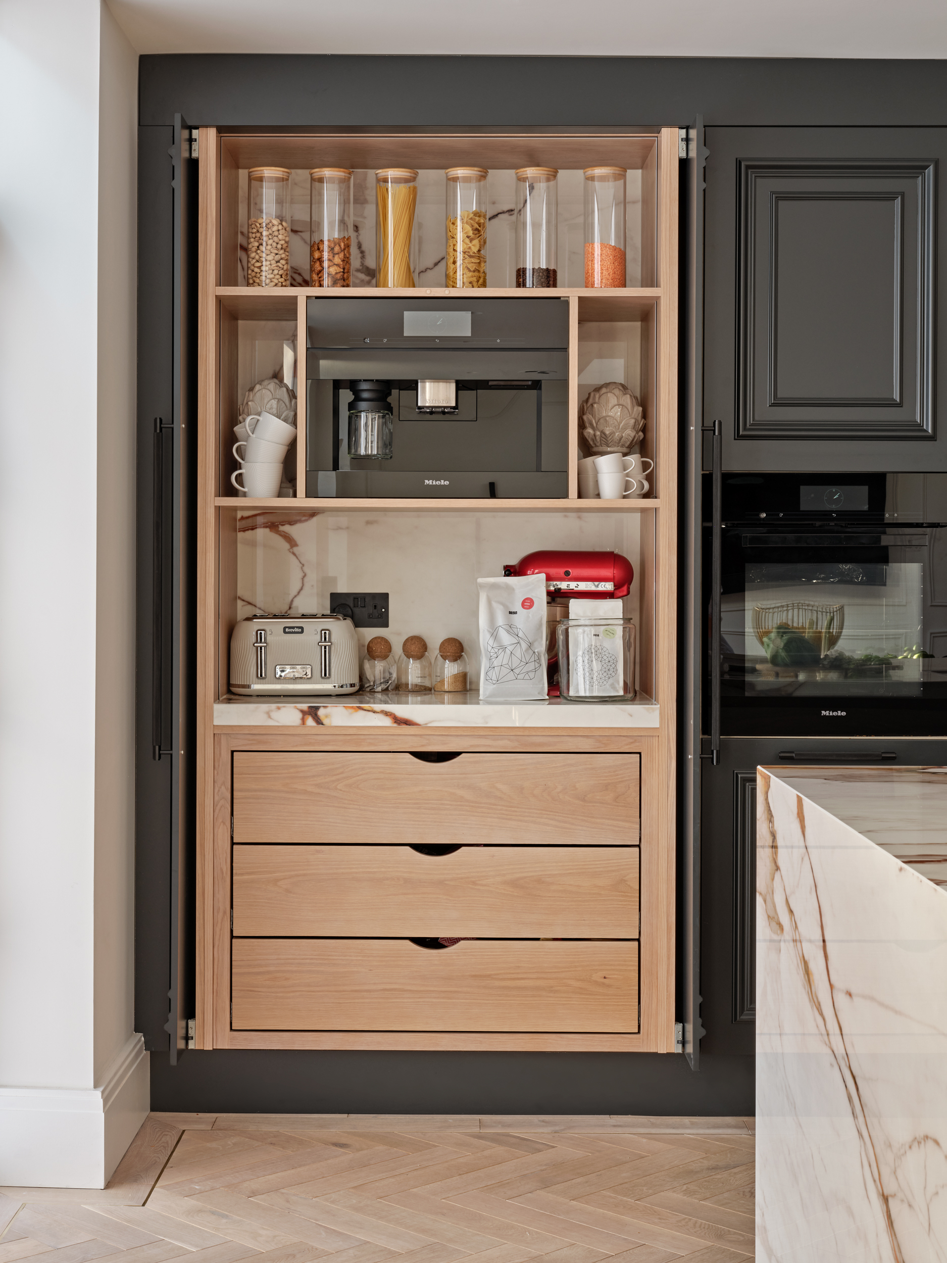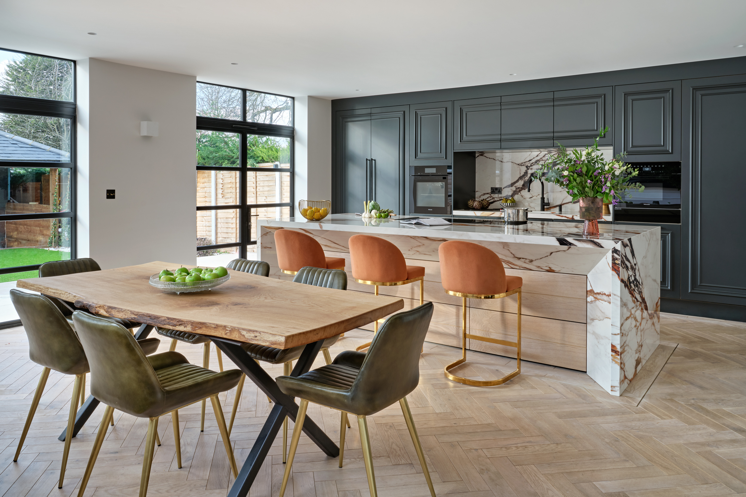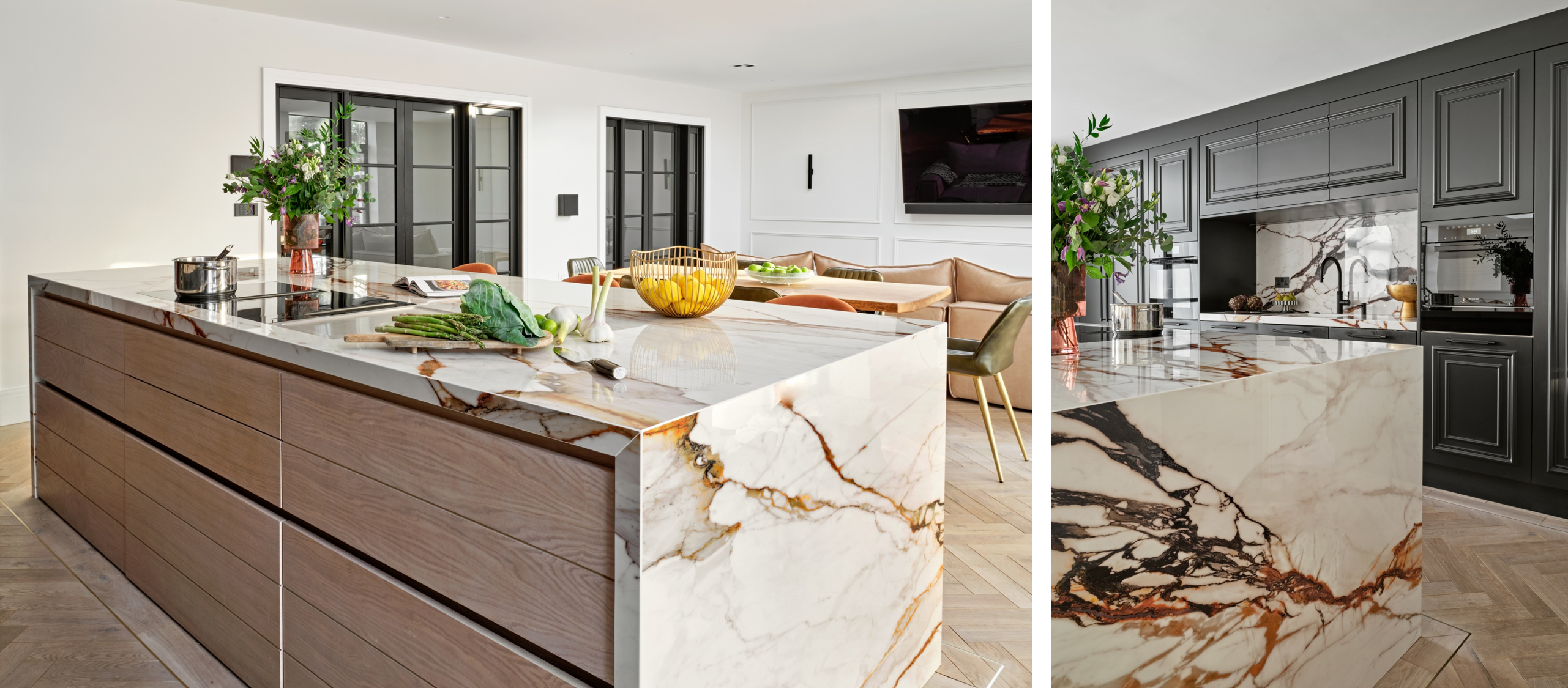 SHEROTON interiors 設計公司於英國SLOUGH規劃的一個廚房空間,運用XTONE流金歲月PAONAZZO BIONDO妝點壁櫃、流理檯面及廚房中島,在深色的櫃體及原木地板間,成為空間中目光的焦點,就讓我一同來欣賞SHEROTON INTERIORS精彩的設計吧!