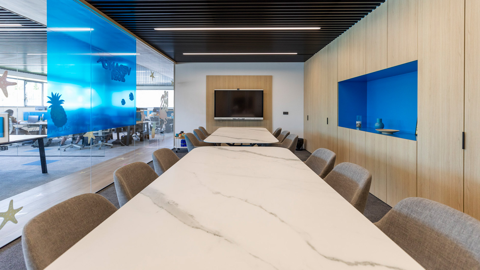辦公室與會議室及連接上下樓層的背光樓梯同樣鋪設Bottega White寶緹嘉白地磚,透過相同材質的地磚讓整體空間感可以延伸。