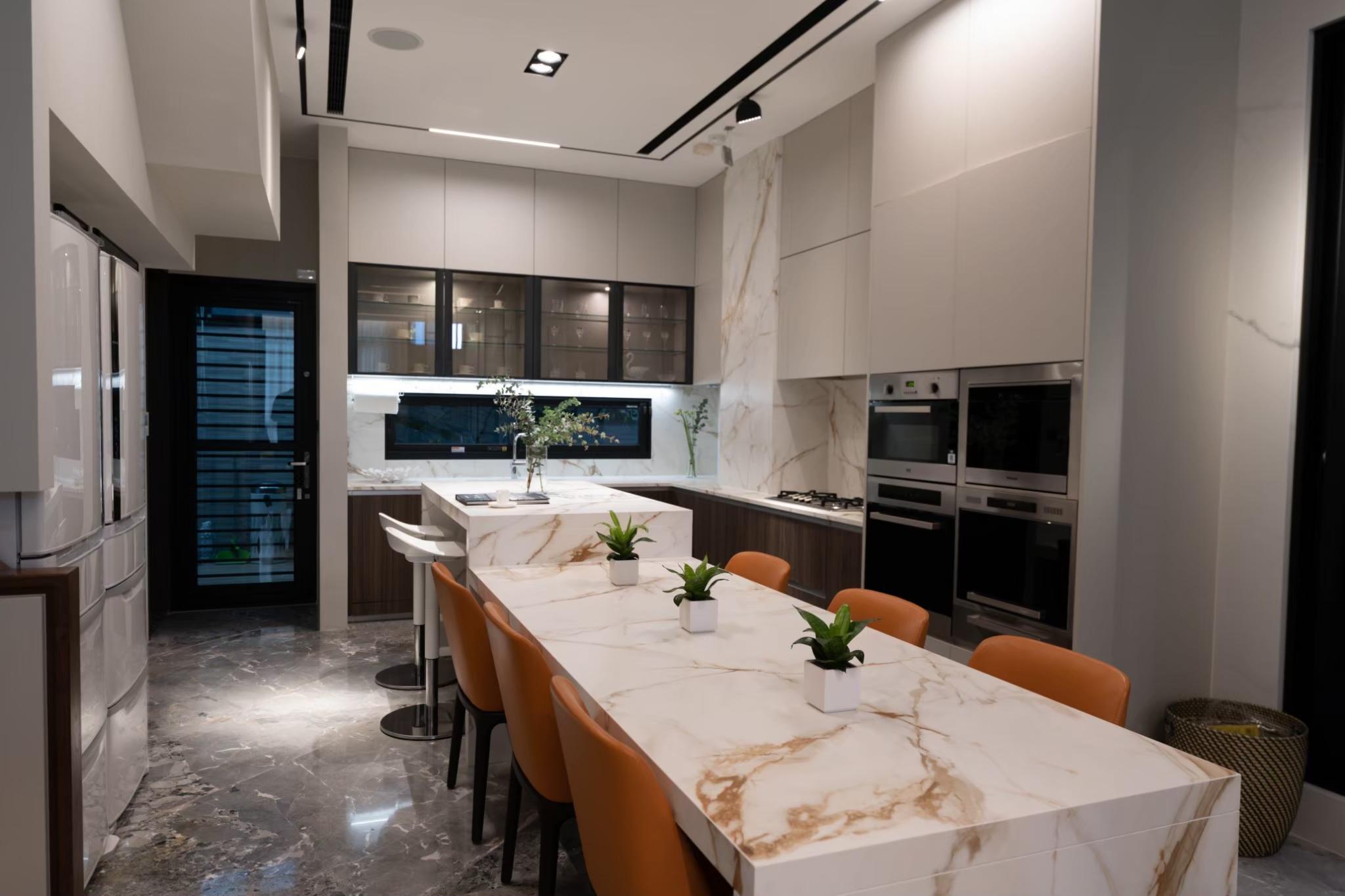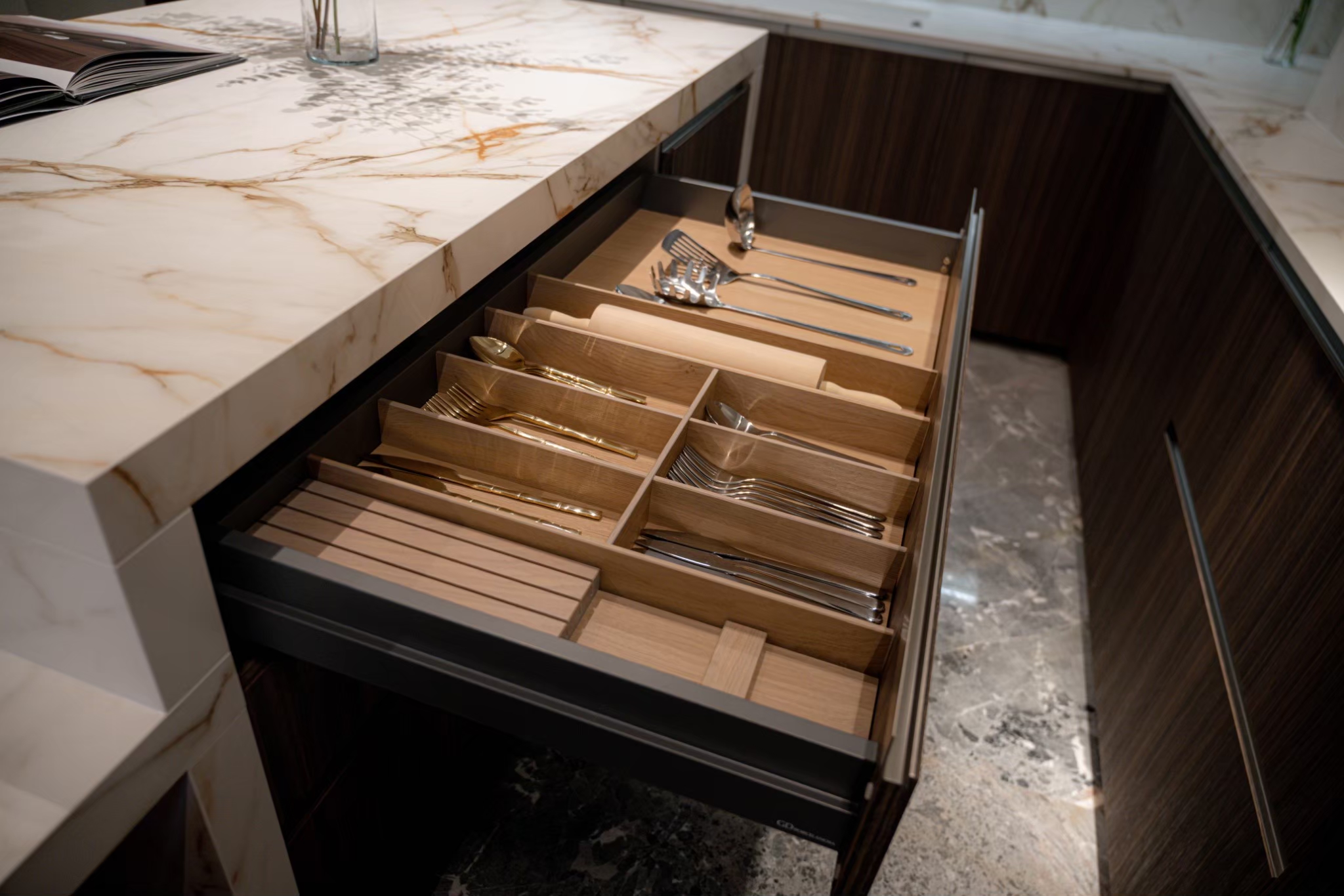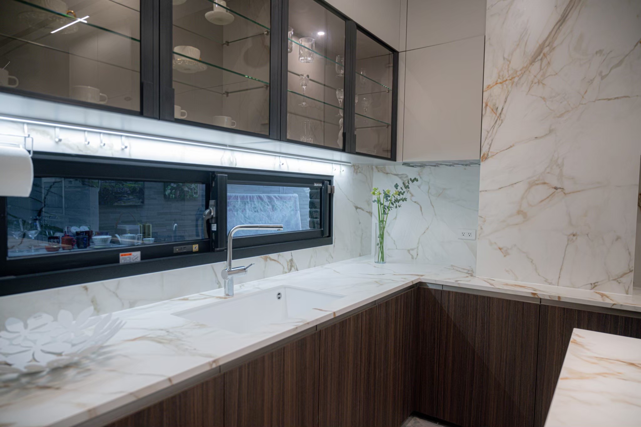 透過與業主多次的溝通,LOAD樂庭設計 張郡庭總監從廚具的配置、動線規畫到檯面、腰牆、壁面材質選用XTONE的CALACATTA GOLD 金卡拉系列輕磁板(6mm)與厚板(12mm),精巧的設計出符合業主所需的廚房空間,更彰顯出女主人的生活品味