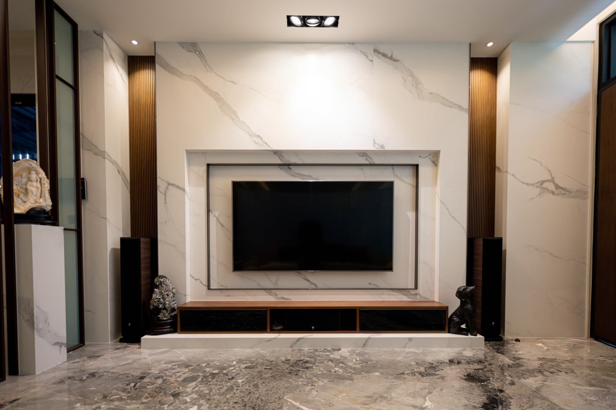 電視牆面同樣選擇XTONE的艾瑞亞ARIA WHITE系列霧面輕磁板(6mm),艾瑞亞系列獨特的順紋設計及擬真天然大理石紋理與灰色的天然石材地板形成完美的搭配,設計師透過高低層次的配置勾勒出石材般的厚實感,讓古典、優雅的電視牆成為客廳的視覺焦點