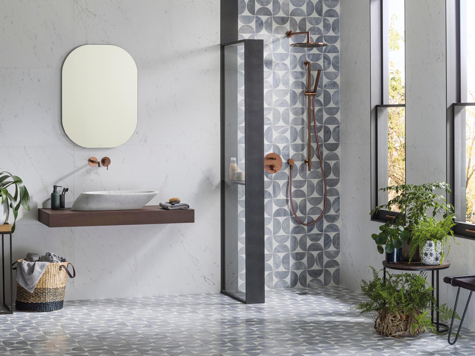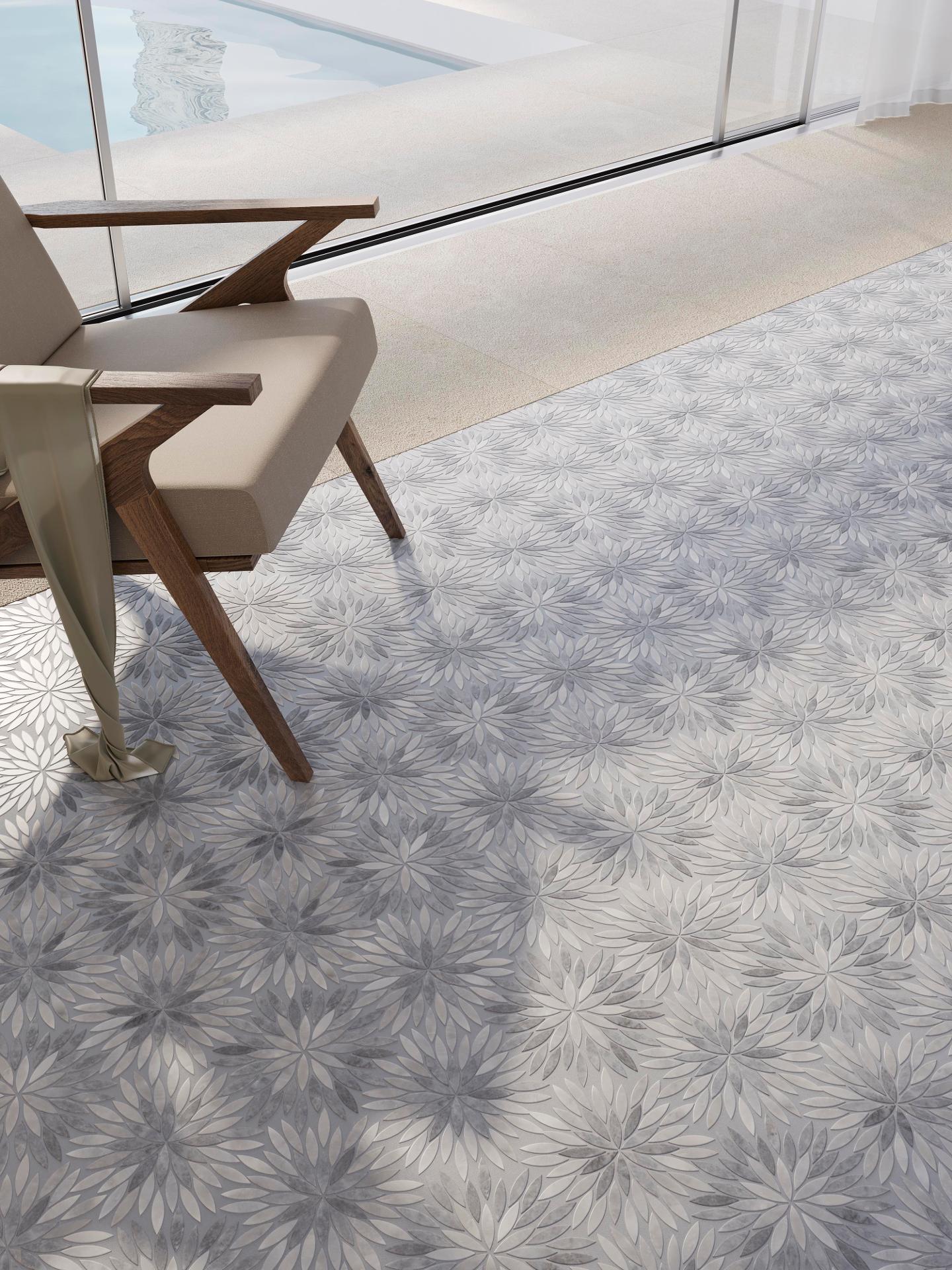 Figure 系列中的幾何圖形和花卉圖案創造出馬賽克活潑的動感,例如貝殼(深棕色貝殼和淺灰色貝殼)、螺旋形(深棕色螺旋和淺灰色螺旋)和花朵(粉菊灰)為空間增添色彩、自然和活力