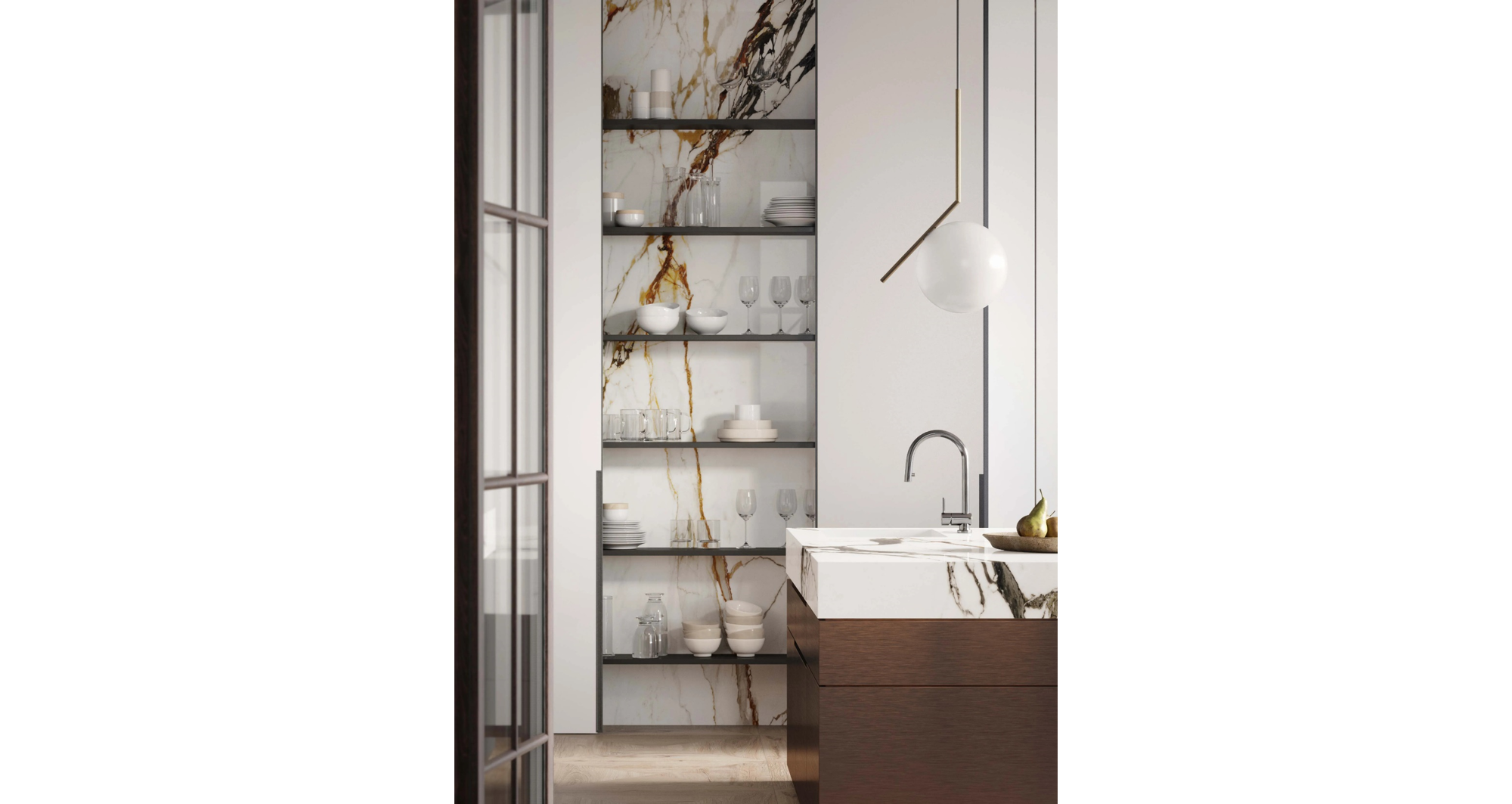 Paonazzo Biondo 流金歲月匯集了大多數冬季色彩。帶有焦糖、鼠尾草和merlot葡萄藤的紋理流瀉在象牙色基底的XTONE輕磁板上,妝點起居室和廚房的牆壁、中島,展現出富麗奢華的貴族氣息。