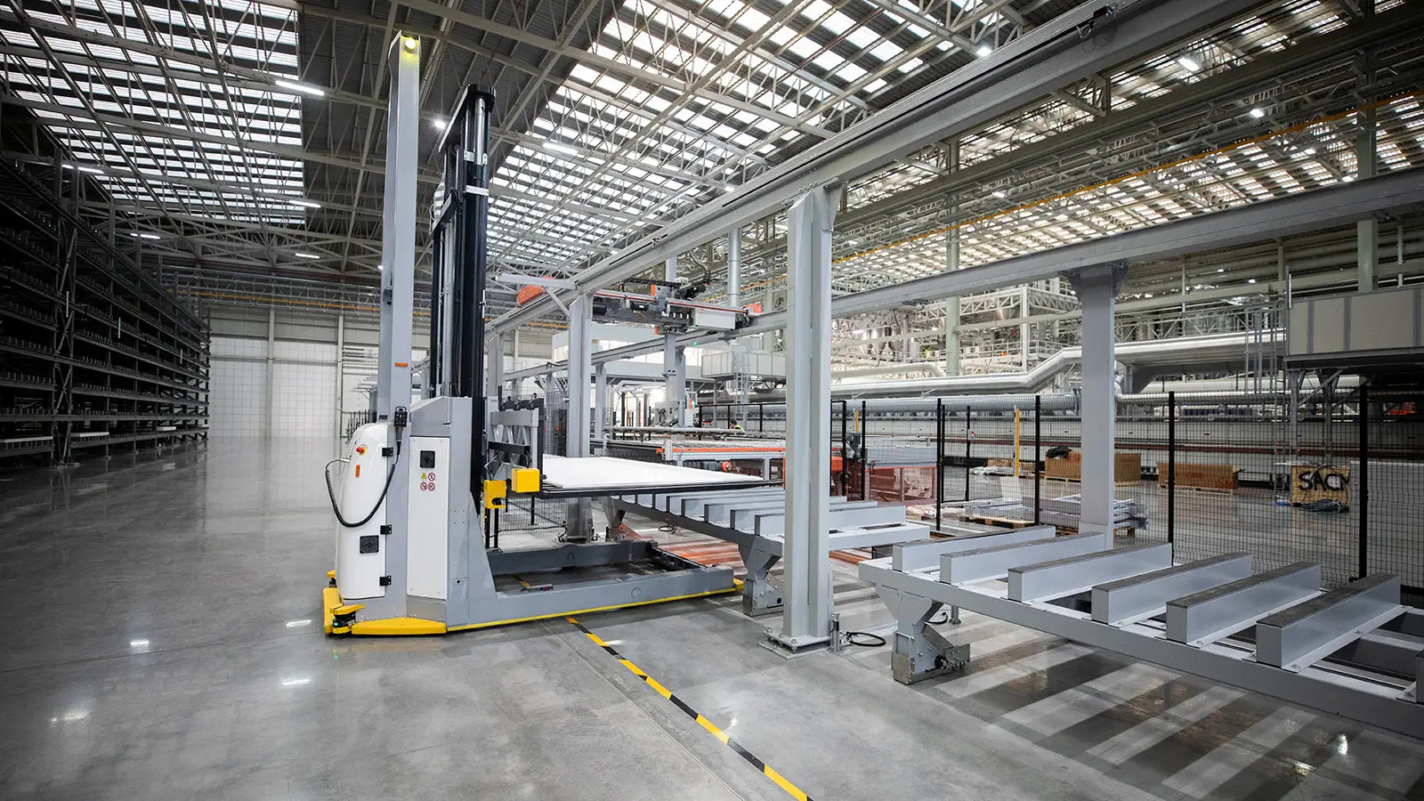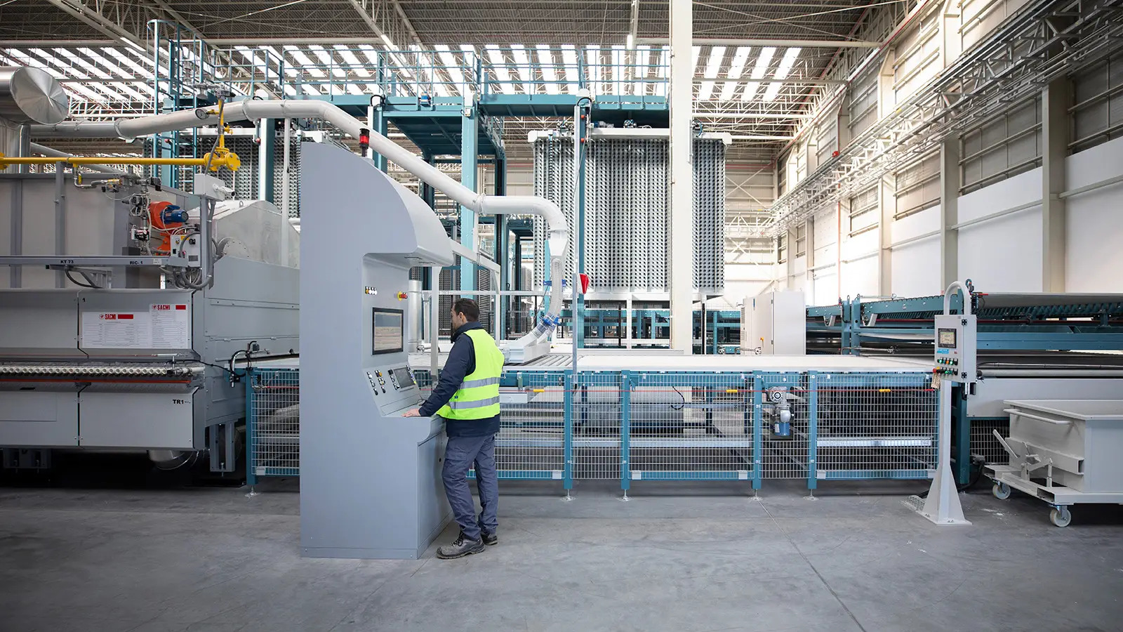 長達250m的全自動窯爐是目前全歐洲最長的窯線,從進料、裁切、加工一氣呵成,並配備了數位檢測系統,每片板材都經過單獨分檢,以確保每片產品都能符合生產標準與要求。檢查合格的板材將進入後期製作區,後製區採用全自動的乾式的自動打磨機、自動背網黏合機和一台拋光機,以滿足不同系列產品的表面處理需求。