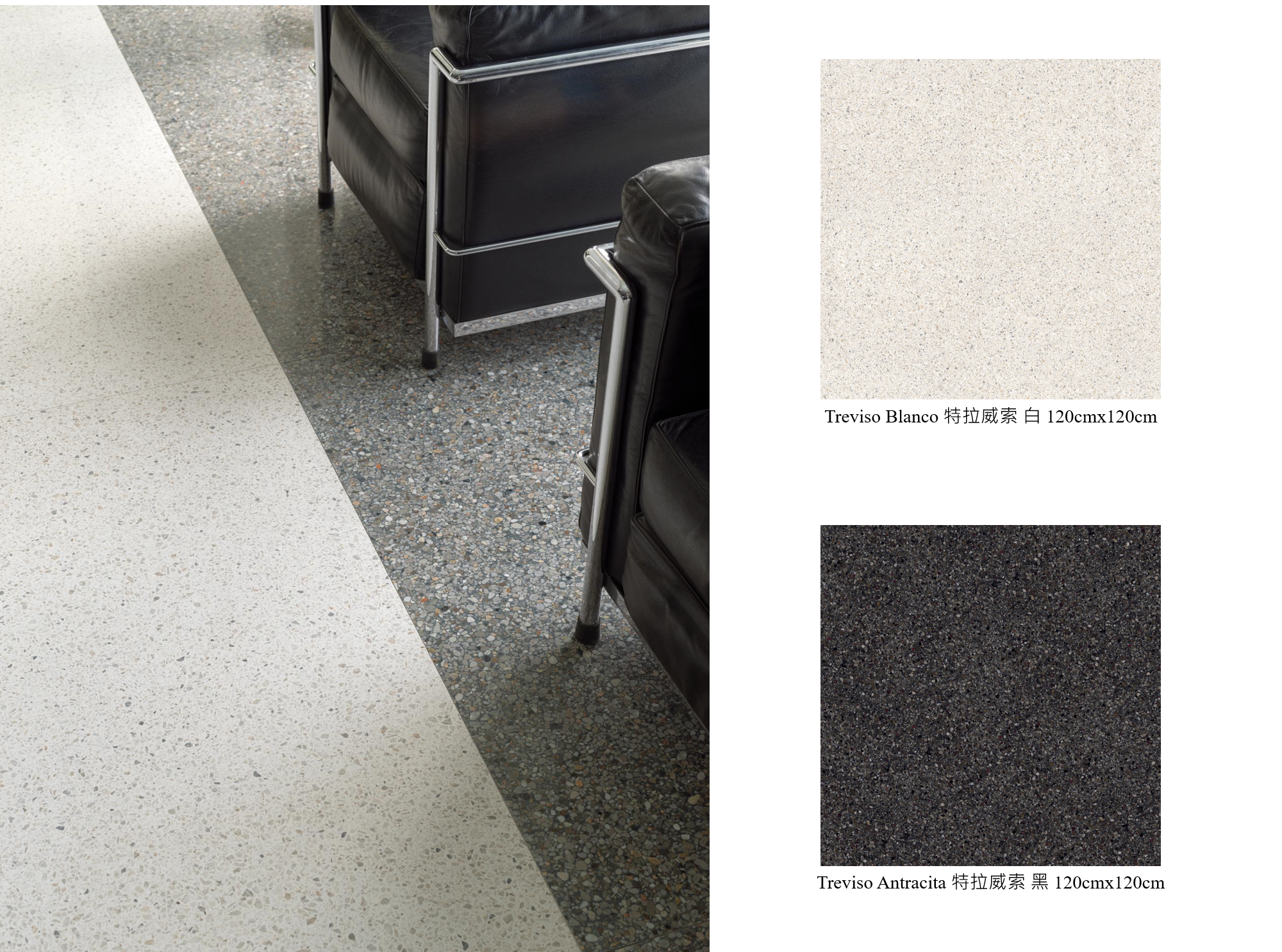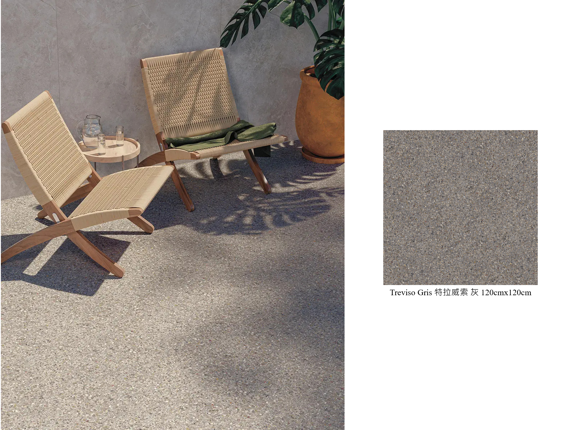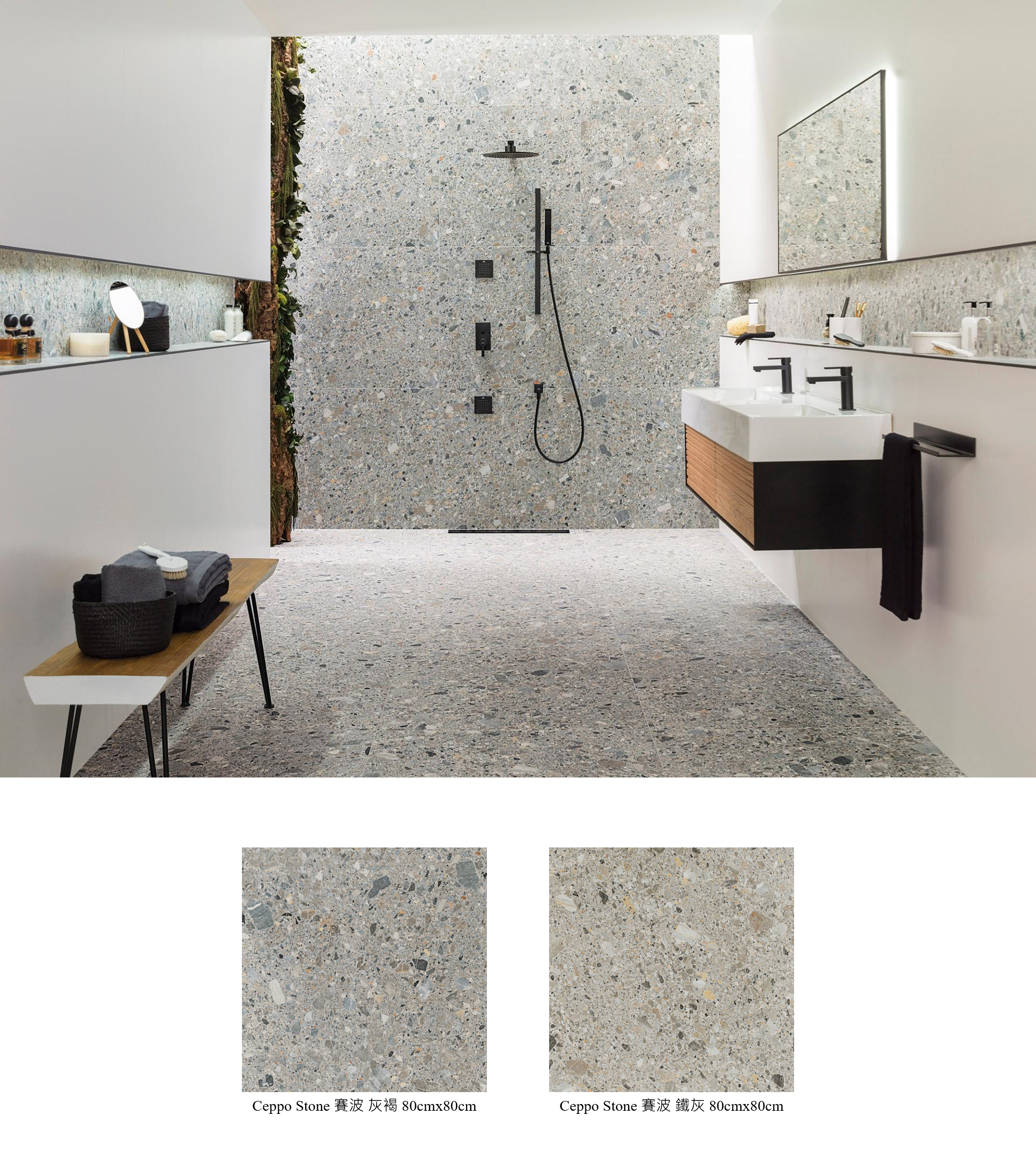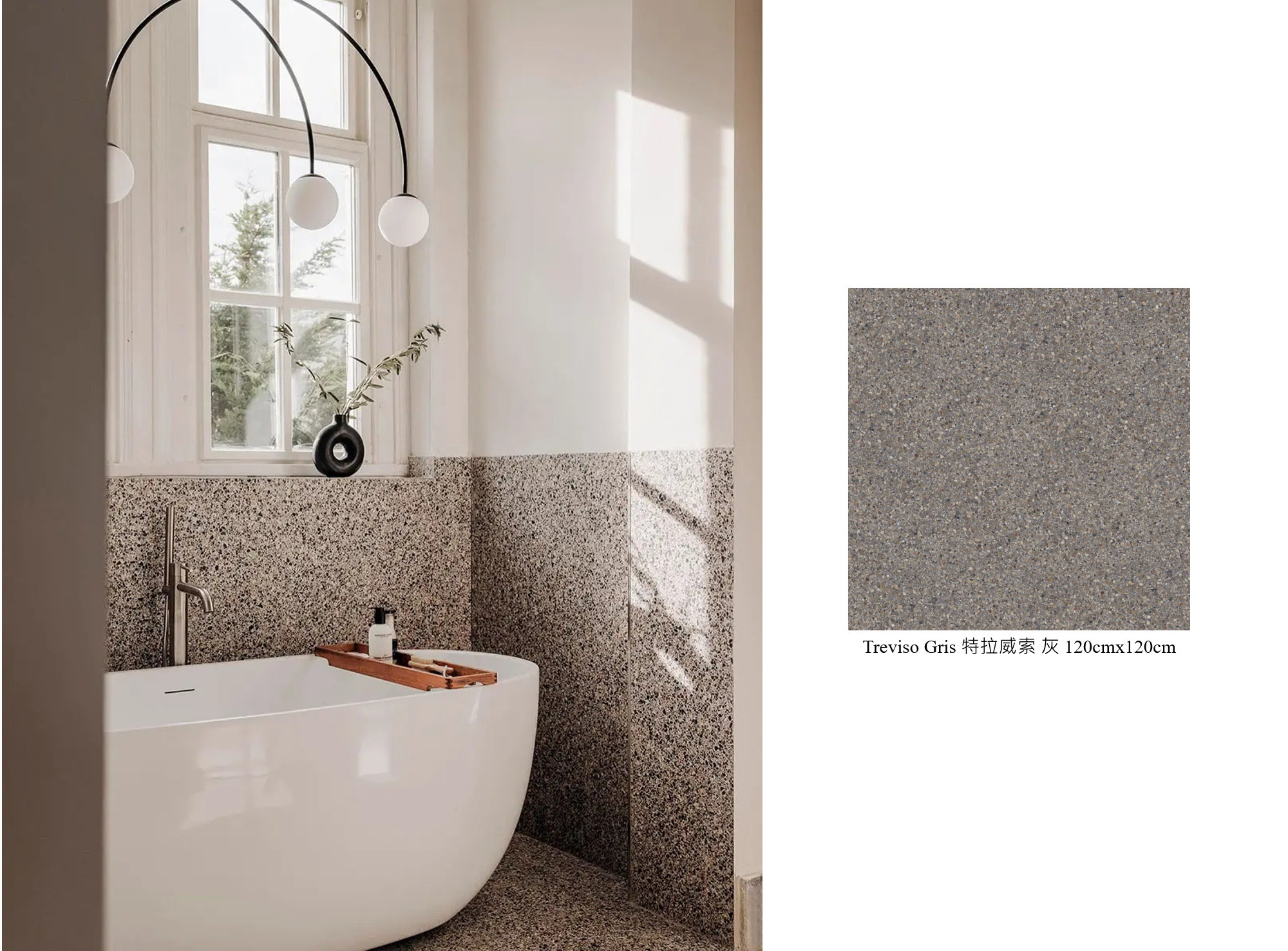 新一代的仿水磨石磁磚,它與傳統水磨石具有相同的美感,極具現代裝飾性,但價格實惠且不會造成龜裂及石子脫落。水磨石磁磚憑藉其獨特的質地、顏色和耐用性,非常適合在走廊、浴室、廚房、起居區甚至戶外空間使用