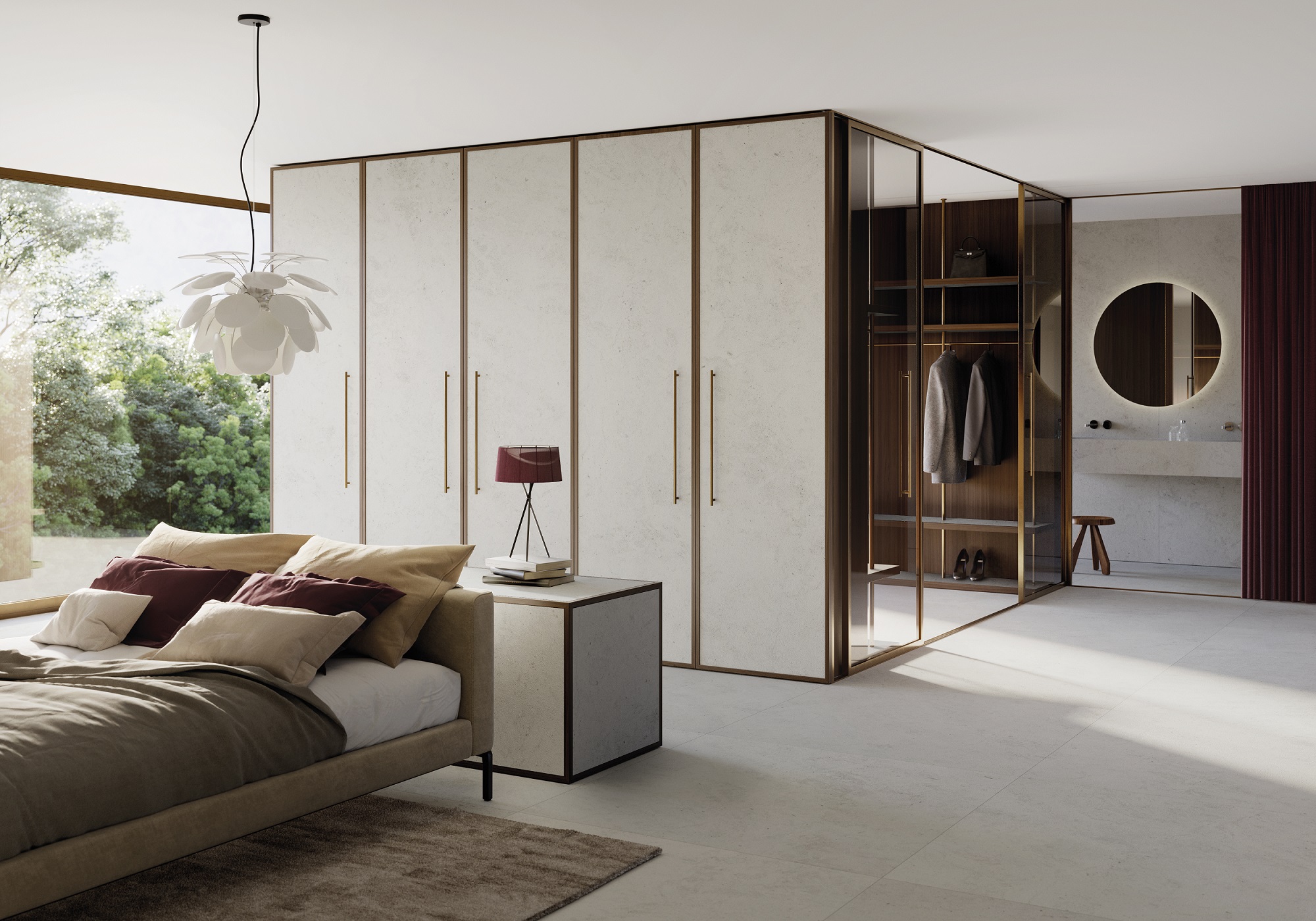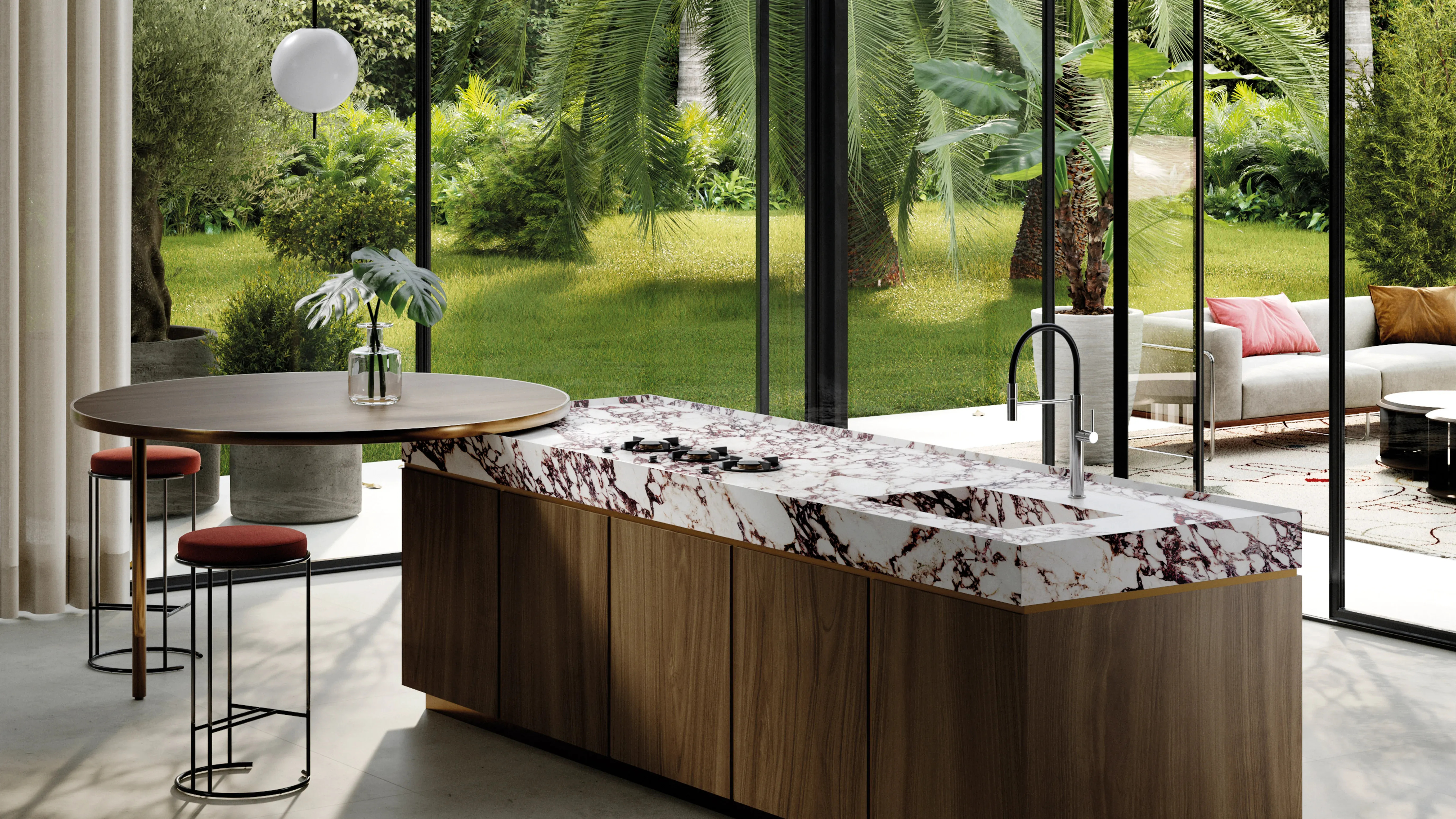 正如我們之前提到的,石材是另一種首選的裝飾材料。像是Viola Rossé紫紅托斯卡納這樣充滿張力的天然大理石紋輕磁板,不論檯面、牆壁、地板和任何建築元素都可以用這種富有表現力的材料來裝飾