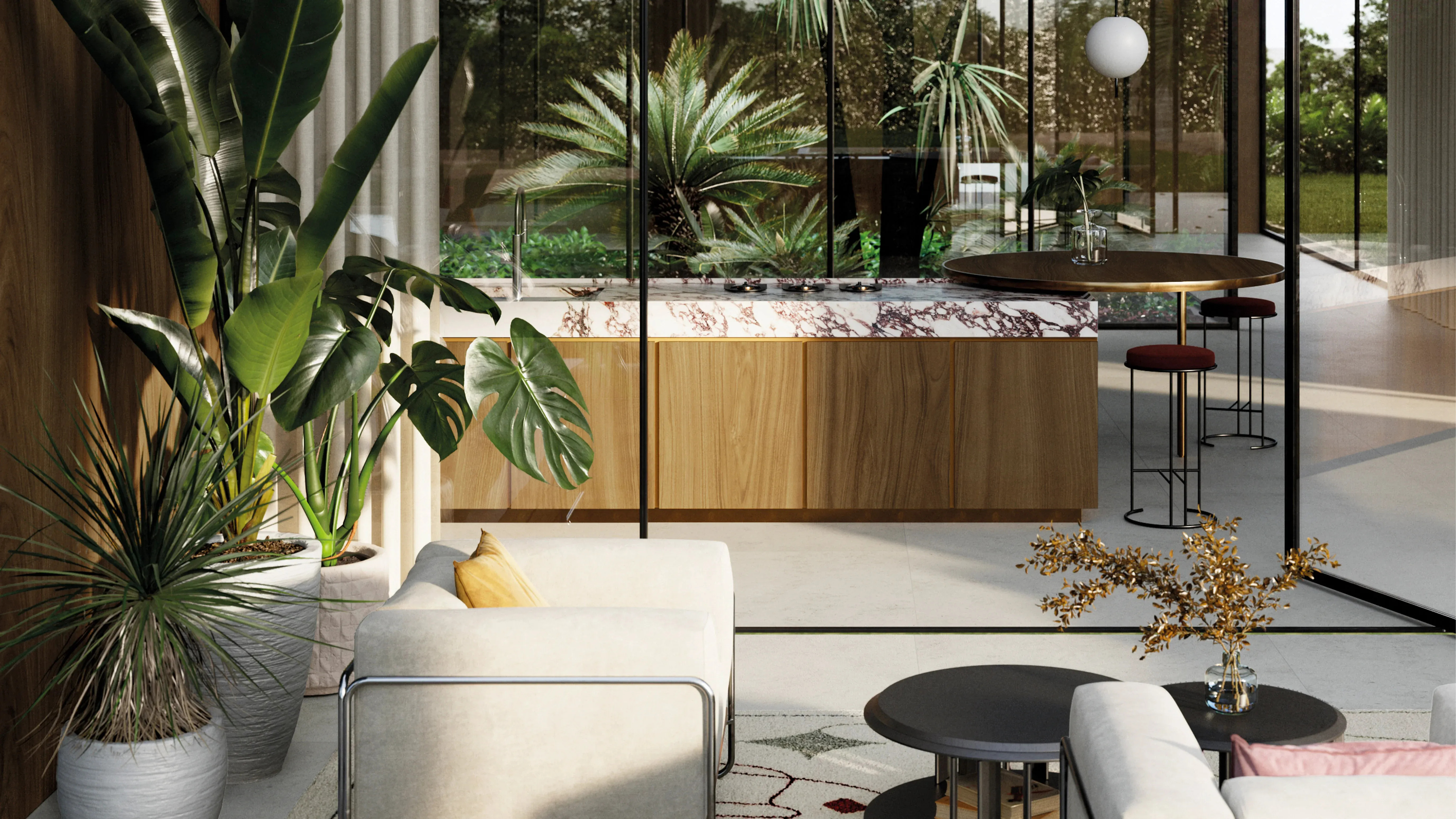 將真正的植被融入家中讓我們可以與大自然真實的接觸。它們不僅帶來活力、能量、美觀並且能淨化空氣,在炎炎夏日更帶來清新涼爽的感受。像棕櫚樹、龜背芋及虎尾蘭蘭等大型的室內植物很受歡迎,它們適合放置在從客廳到浴室的每個角落
