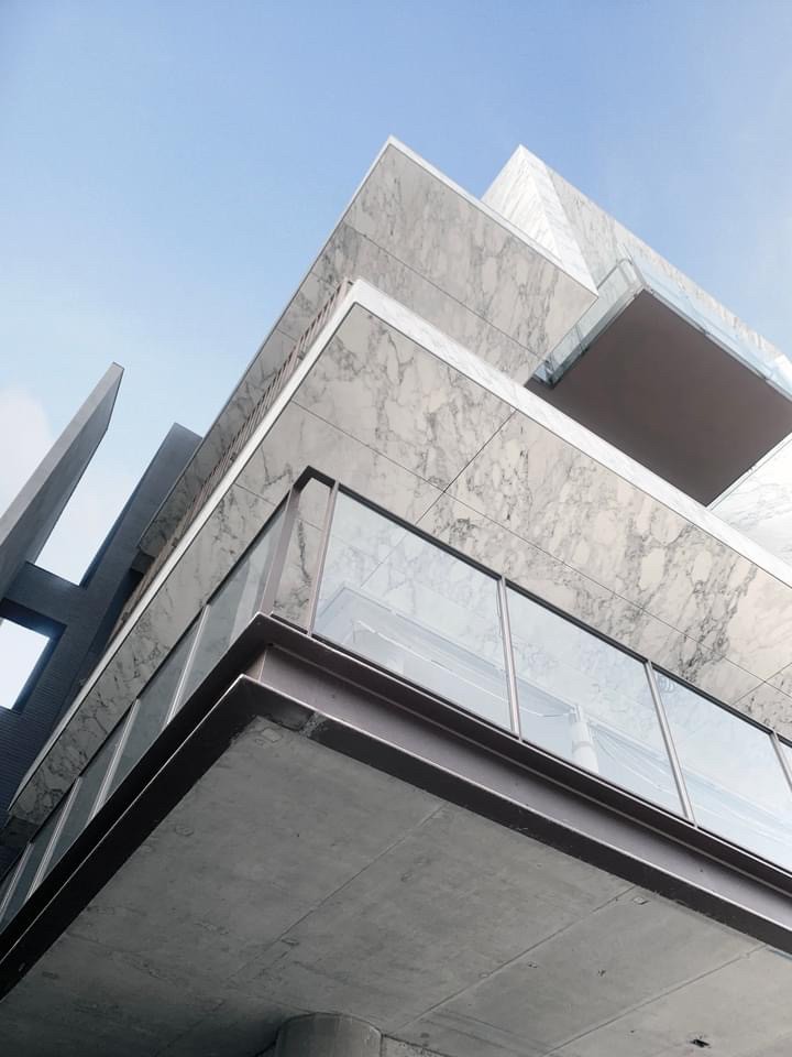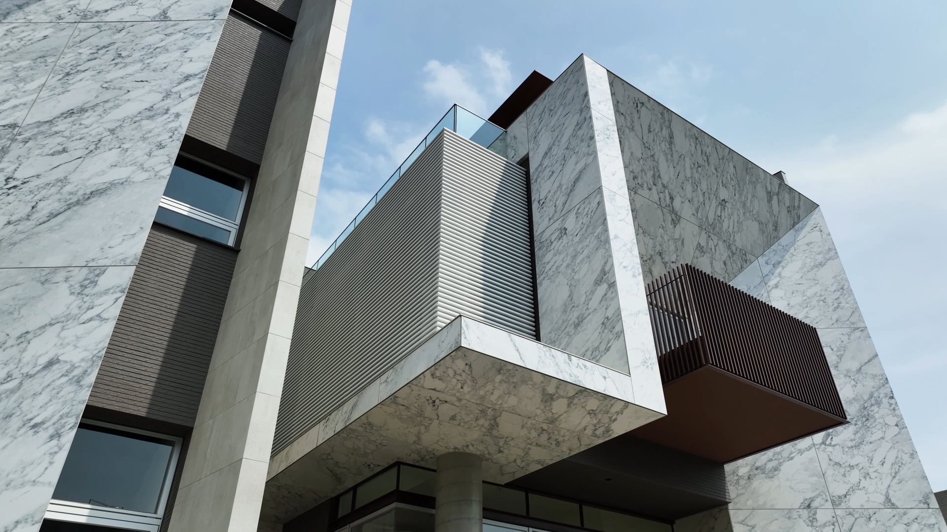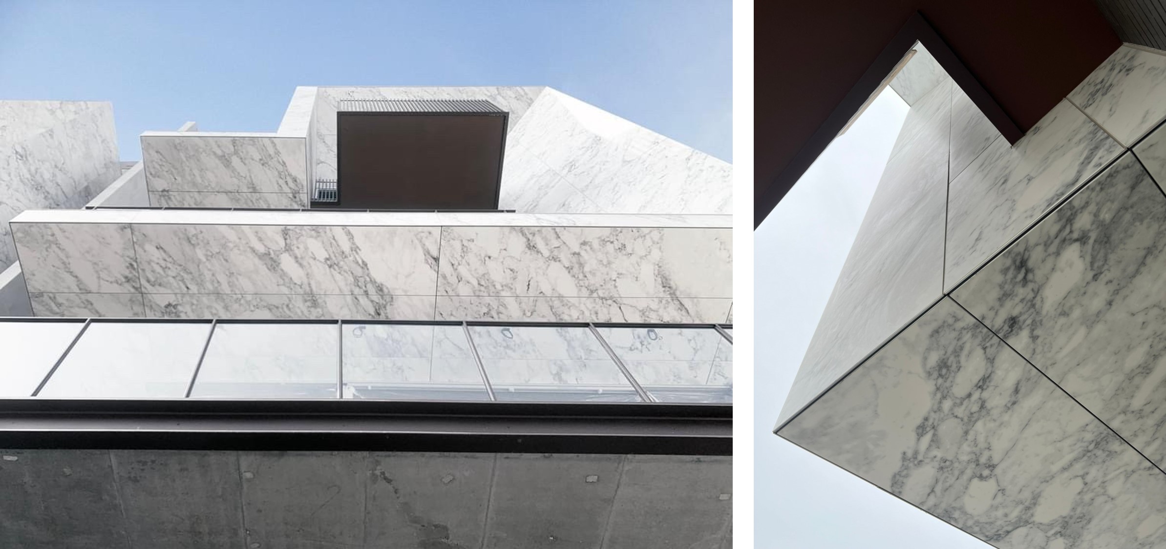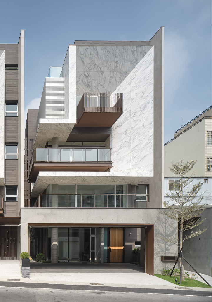 不同於台灣常見的二丁掛、金屬帷幕或花崗石材…等外牆材料,「誠美無二」為打造具有大理石紋路的獨特立面,特別選用「西班牙寶瓷蘭XTONE艾克石」,解決傳統白色大理石受限於重量、吸水率、易汙染等因素無法施作外牆的限制,XTONE艾克石接縫少、可接續紋路的磅礡效果,甚至能鋪設天花板,讓整個立面設計往裡延伸,天地壁結構與設計連成一氣。