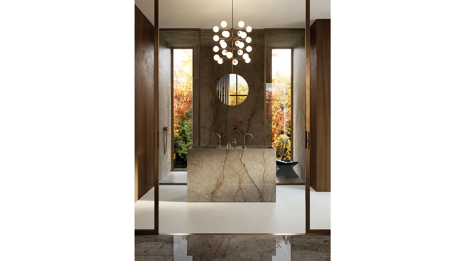 尺寸豐富的Astana Grey阿斯塔納灰,可運用在不同空間的裝飾上,像是160cm x 320cm x 1.2cm的厚板可用於中島及流理檯面上,客廳、臥室或是浴室的地壁空間則可選用120cm x 250cm x 0.6cm的輕磁板。Astana Grey阿斯塔納灰柔和的色調和醒目的棕色紋理,為空間增添了個性,呈現廣袤大地的空間尺度、彰顯自然之美
