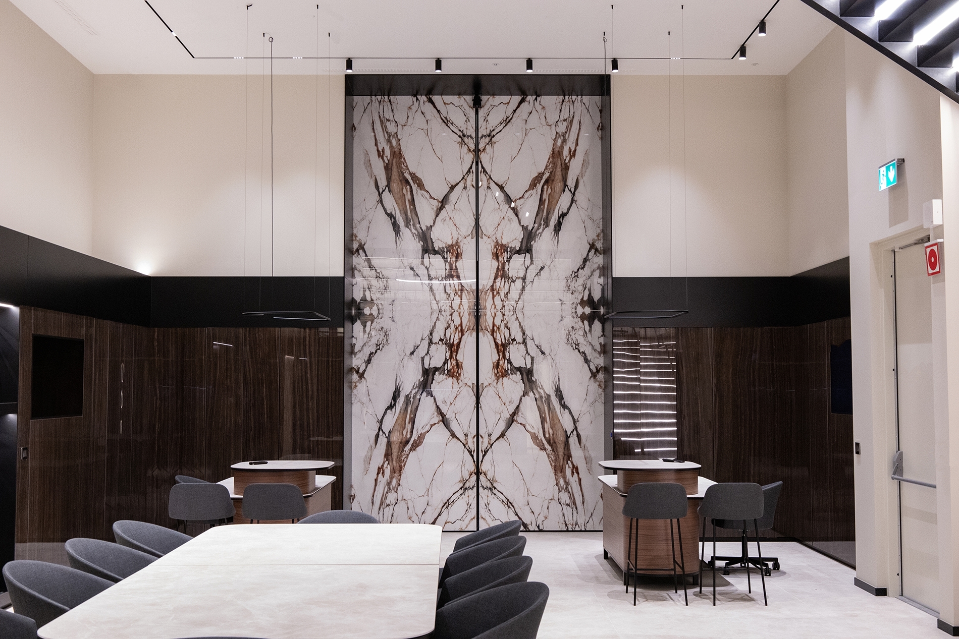 一進入接待大廳,設計師將XTONE的Calacatta Green綠卡拉輕磁板串連起天地壁面,凸顯了輕磁板較石材輕盈,可鋪貼於天花板上的突破技法;仿真的印刷技術烘托鮮明的綠色線條,透過超大尺寸規格拼接,在鋁擠光帶的延伸下,讓材料的美學特質於空間盡情詮釋,彰顯磅礡氣勢