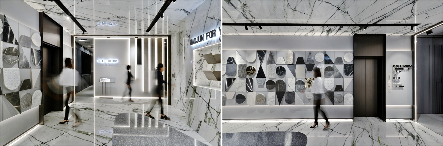 輕磁板串連整體空間,烘托磅礡絕美氣度,鋁擠光帶導引人流至各個展間。另一立面將幾何線條的磁磚裁切拼接,在光線折射、映照下,彰顯獨有花色、形狀,轉化為空間美感的概念,呼應「磁磚就是藝術」的美術館陳列思維