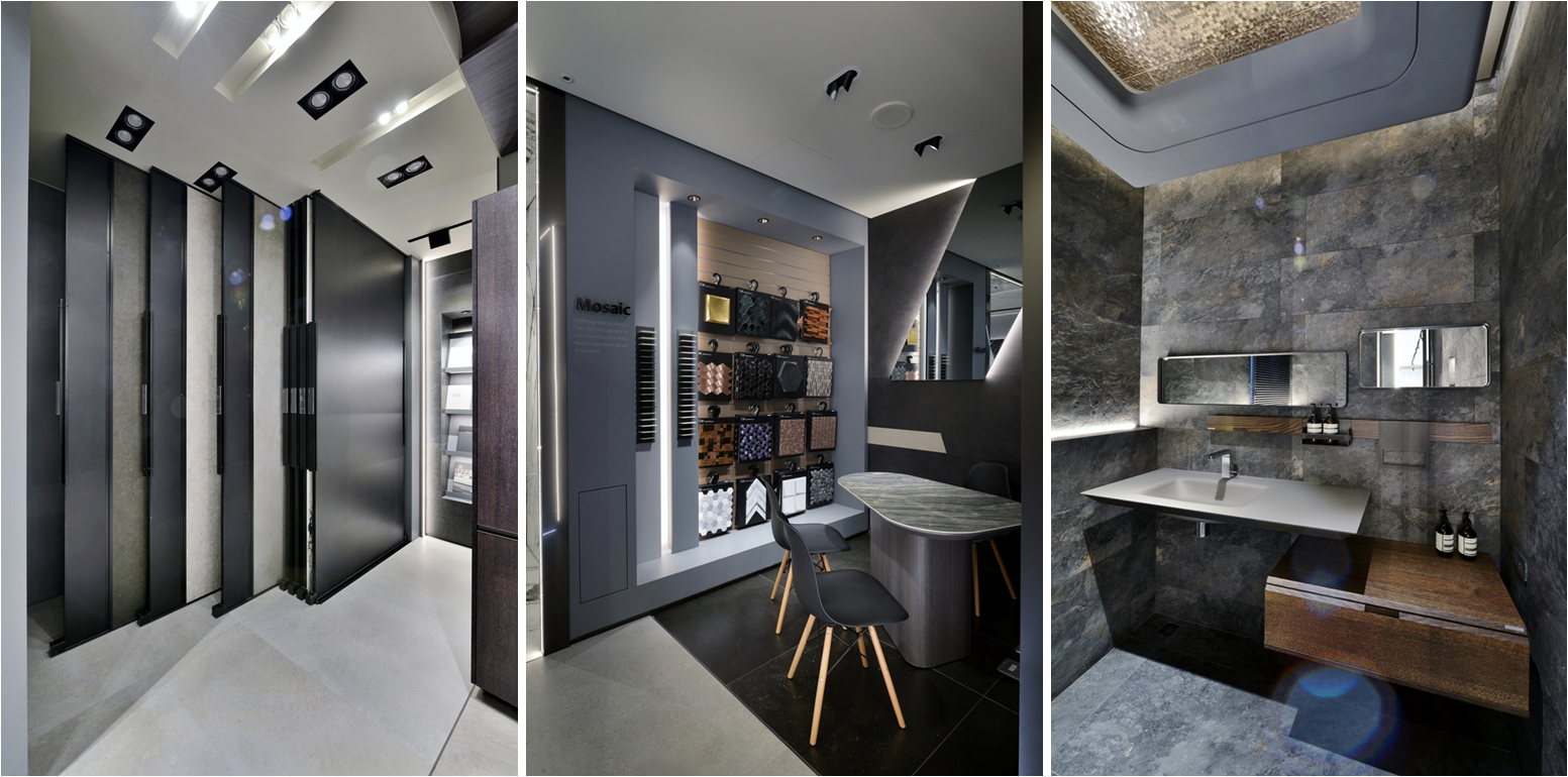 位在台中七期的台中旗艦館,以溫馨的「家」為設計理念打造100坪的展示空間,營造出「溫暖、關心與愛」的展演氛圍。整體空間劃分「接待大廳」、「生活場域」及「磁磚圖書館」三個區域,結合多元建材的活用與設定下,刻劃出獨一無二的專屬樣貌