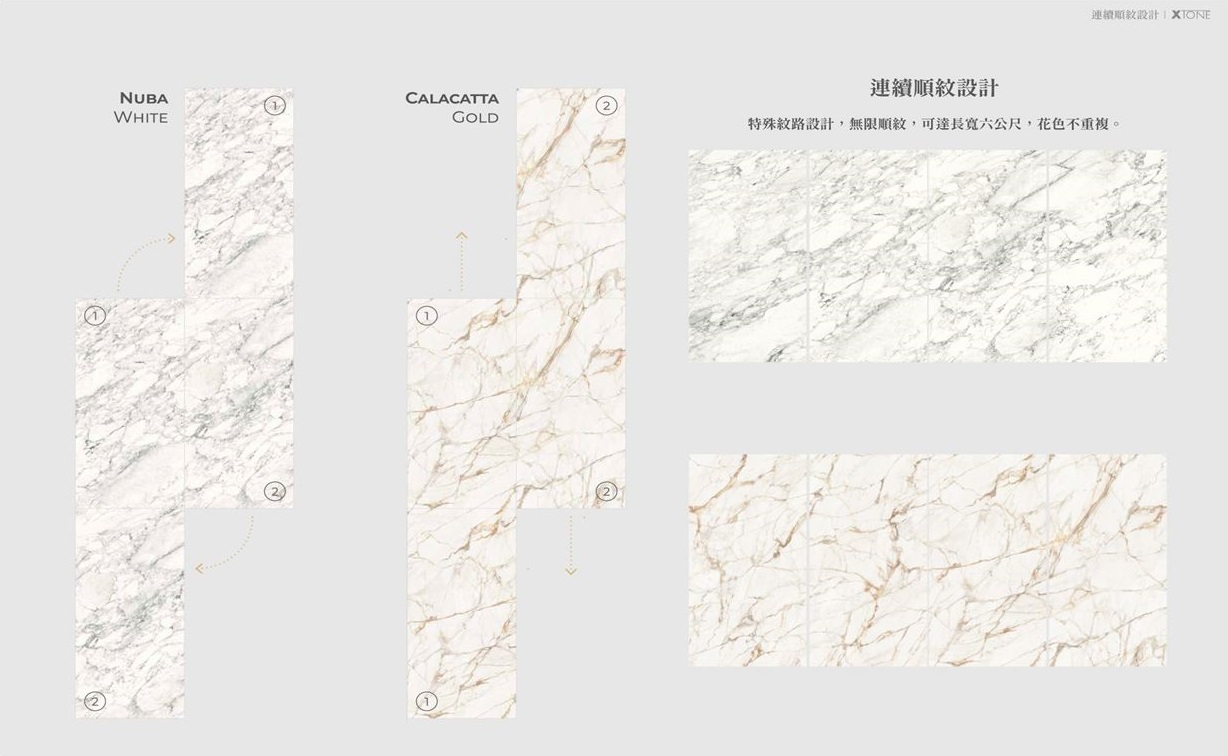 此外,「水平連續順紋」、「垂直連續順紋」的拼接技法,創造出連續紋路與一體成型的視覺感,成為業界最領先技術,運用拼接方式的創新,加上拼貼縫隙小,可打造出比一般磁磚大3倍的面積,運用在豪宅或大廳公設可創造出恢弘的器度,突破石材無法營造出的視覺震撼效果