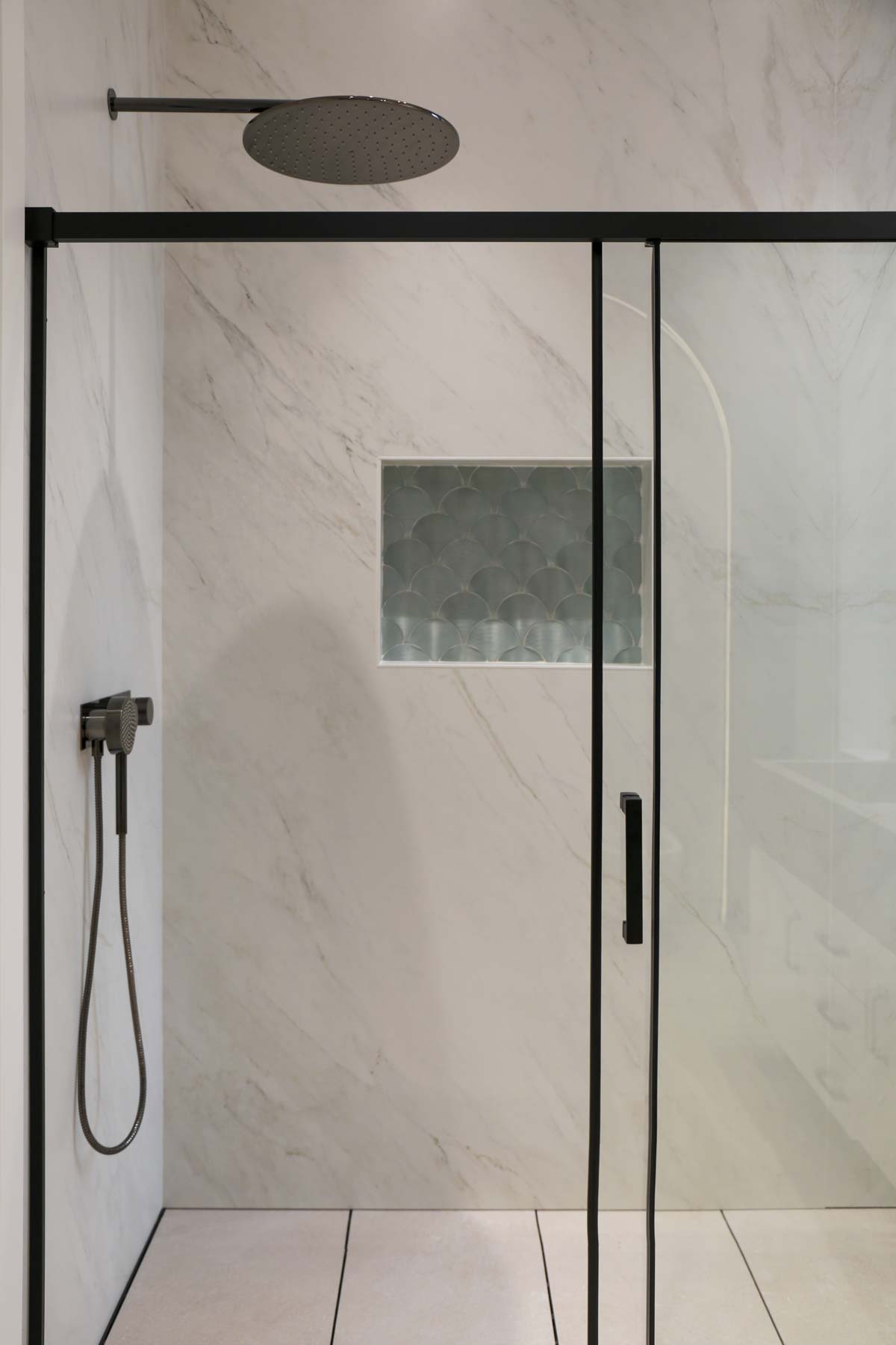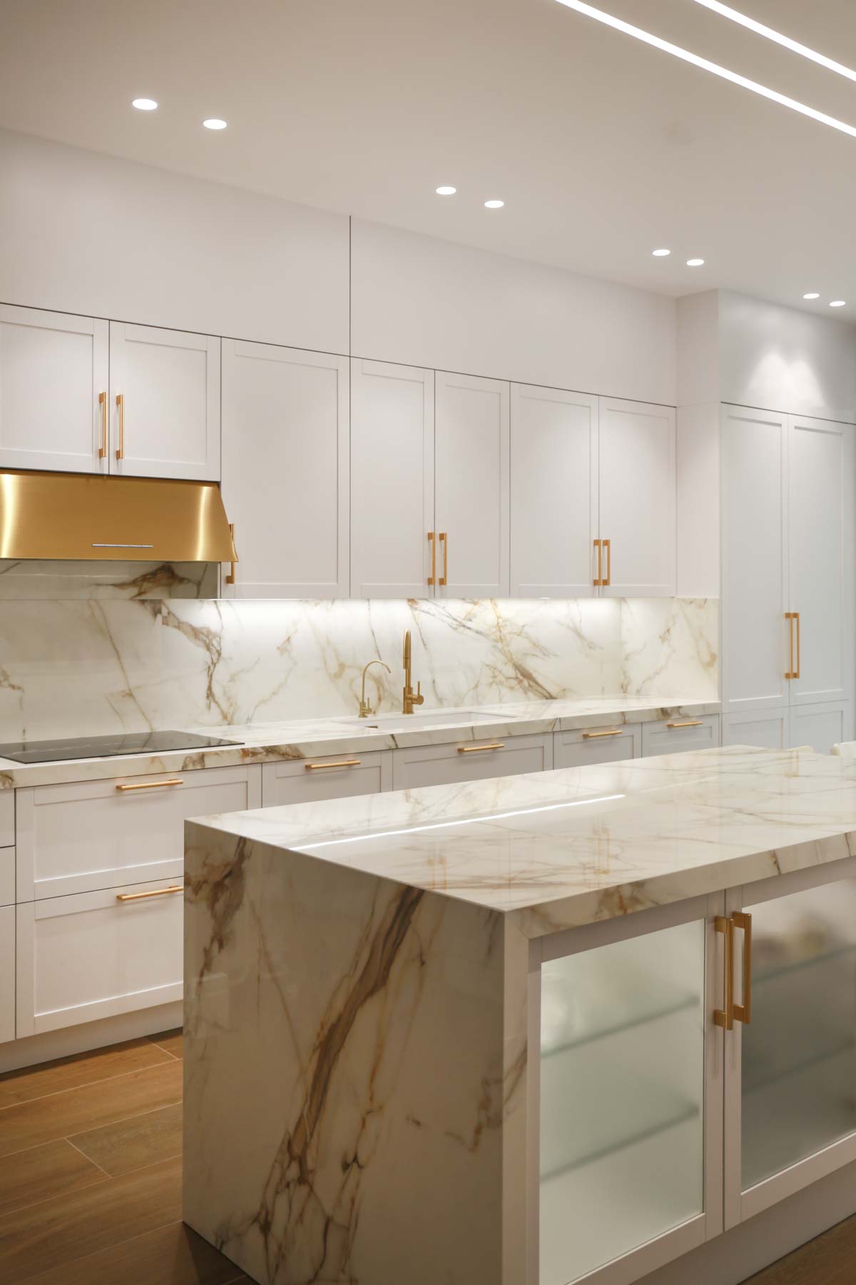 從室外到室內,空間皆選用 Porcelanosa 各系列建材精心搭配。地坪鋪設石材質感的 River 長河系列與 Adda 艾達系列;牆面則採用白色大理石紋薄板 Glem White 格林白與壁磚 Japan 大和系列,形塑出俐落連貫的視覺延伸。檯面部分則選用 XTONE 艾克石白色底蘊勾勒金色紋理的 Calacatta Gold 金卡拉厚板磚,在色調上一致呼應,並藉由紋理細節提升整體質感與空間層次,讓日常接觸的每一面都充滿溫潤與品味。
