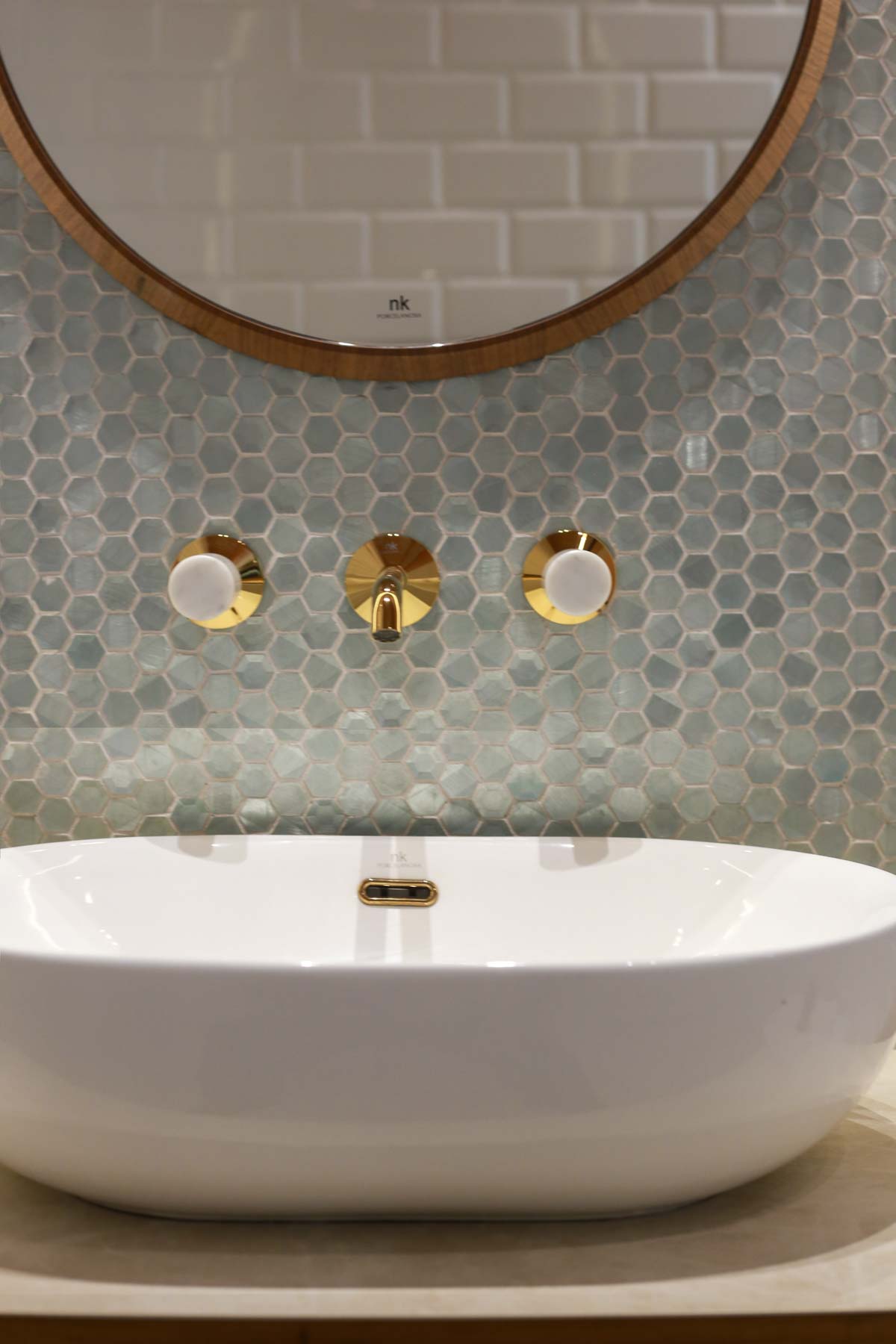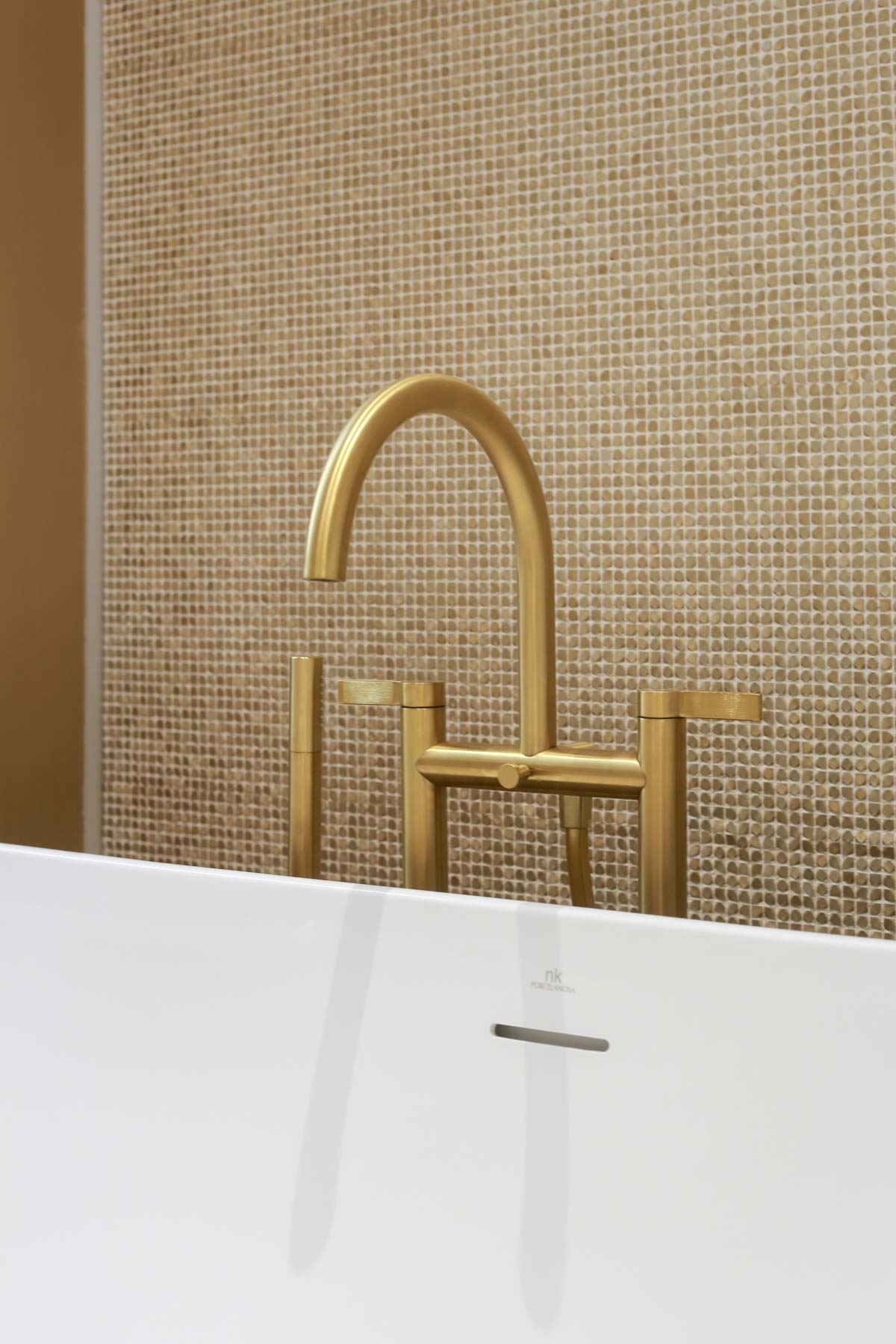 馬賽克磚的應用則為空間注入靈動氣息。局部以帶有金屬感的馬賽克磚點綴,成為材質間的過渡與視覺焦點,不僅打破單一材質的節奏,也展現 Porcelanosa 對細節設計的極致追求。