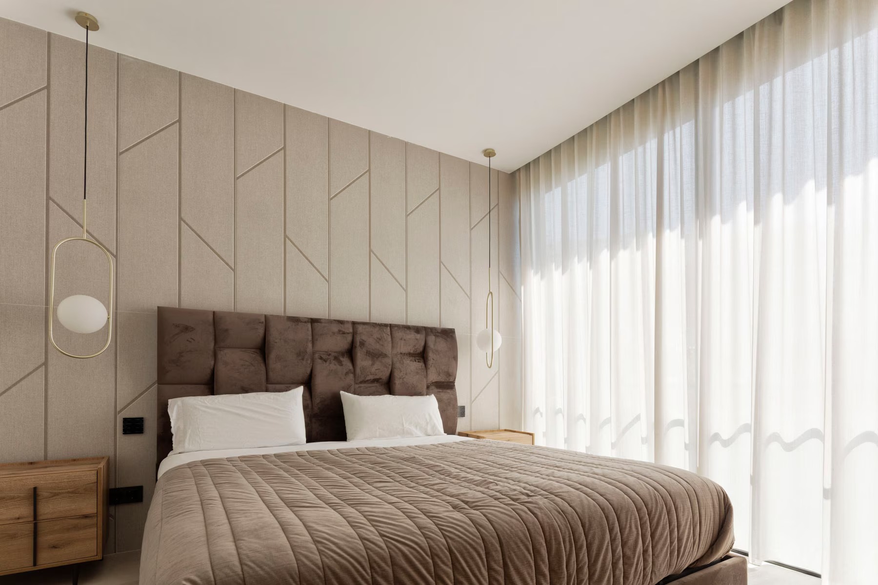 臥室則以 TAILOR 米白色壁磚呈現,延續整體柔和的色溫與自然質地。細膩的表面肌理讓空間呈現輕盈、放鬆的氣息,與地中海住宅中強調的明亮與開放感相呼應,使居者在安靜的節奏中找到內在的平衡。