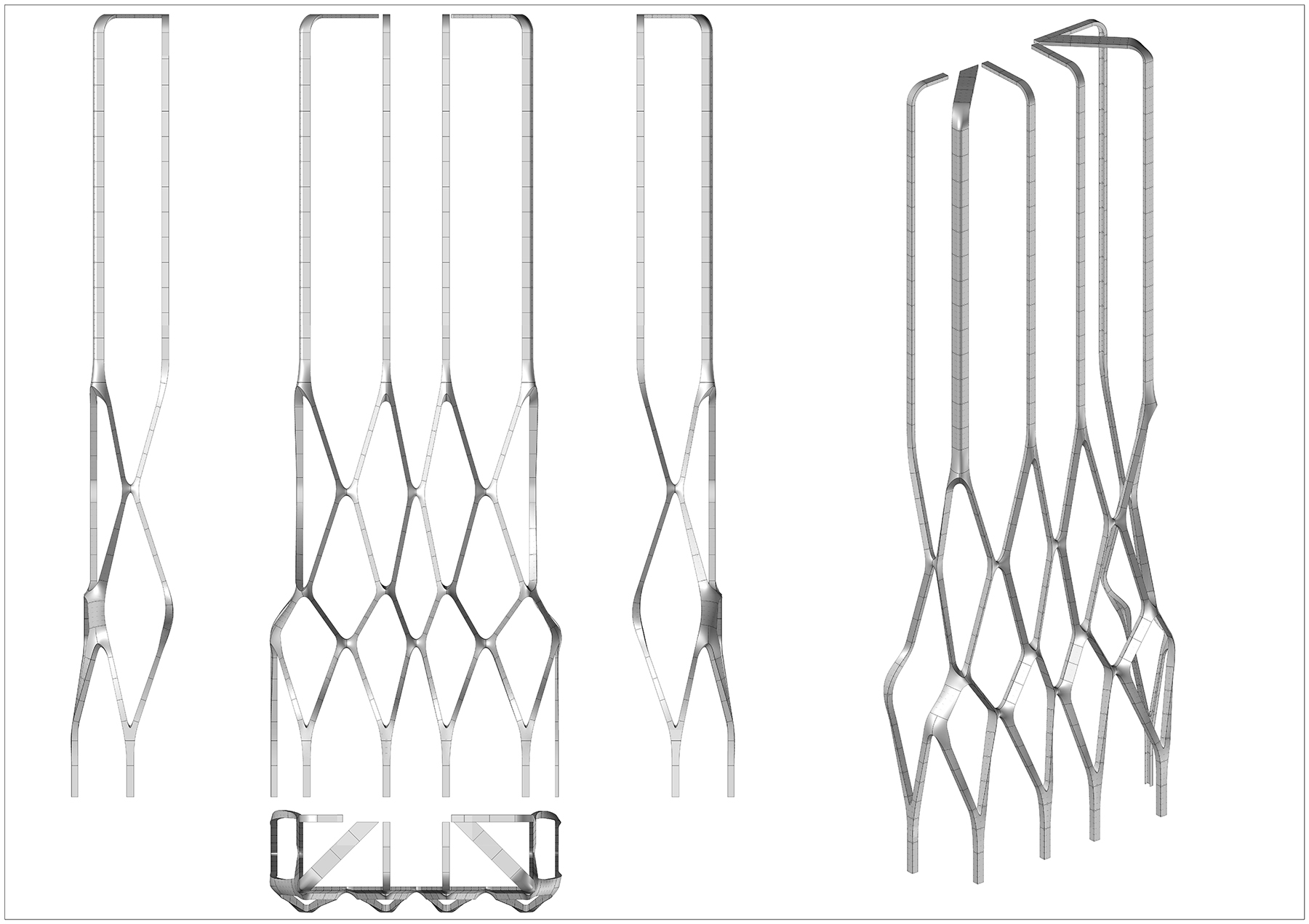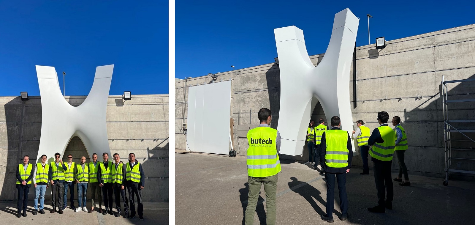 這引人注目的外部結構是由250個節點模組(直型、對角型和角型)及各種不同的模具組立而成。為了確保該專案的成功台灣宥鋐貿易特別邀請國礎建設工程團隊一同至西班牙PORCELANOSA Grupo總部,由Butech專業團隊建造了一個具有雙曲線(4 m x 4.5 m)節點件的1:1比例原型。其立面內部結構、固定系統和預製模組的設計均由Butech的建築師和立面工程師精心設計,並由國礎建設工程人員逐一確認符合建築圖面設計需求。