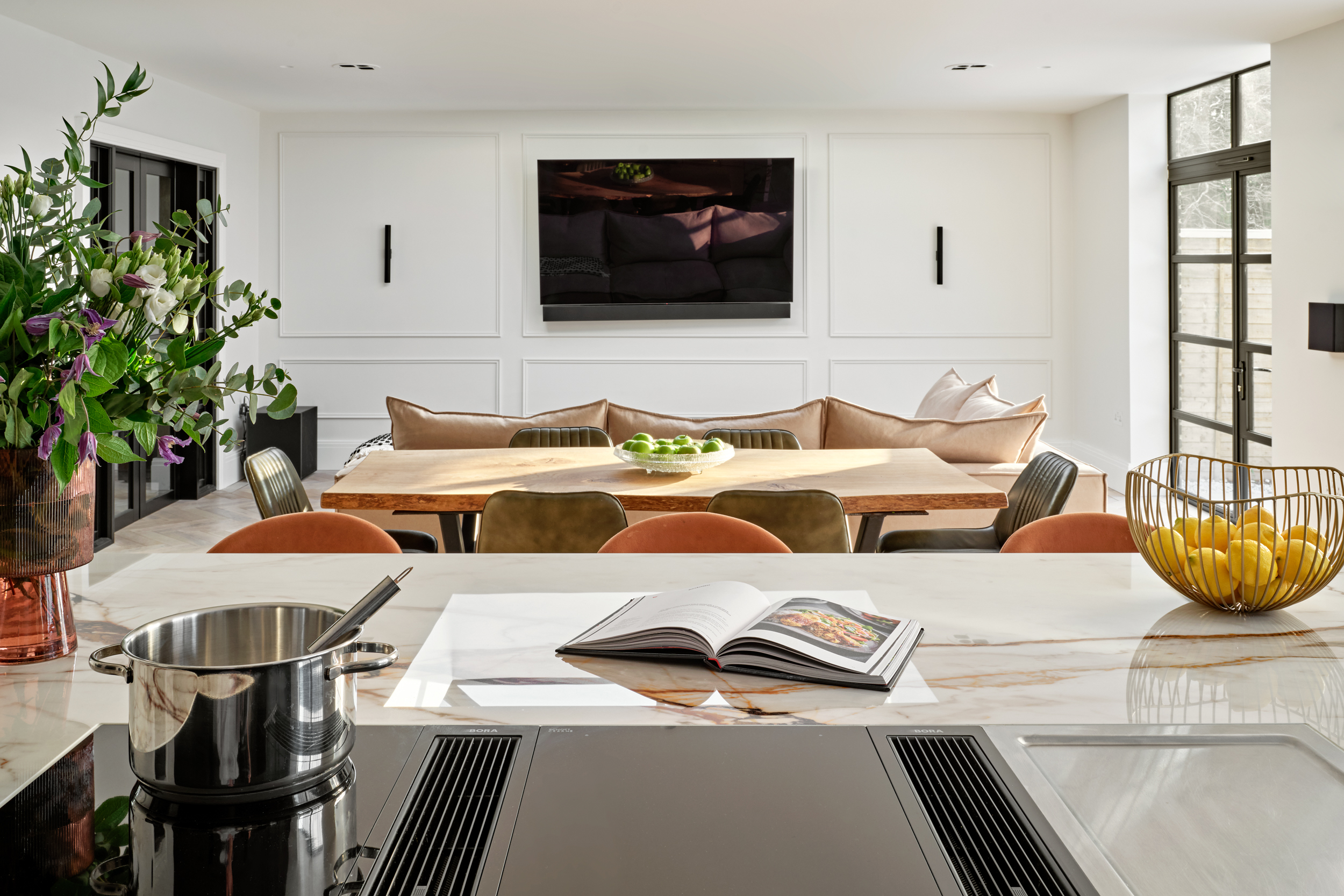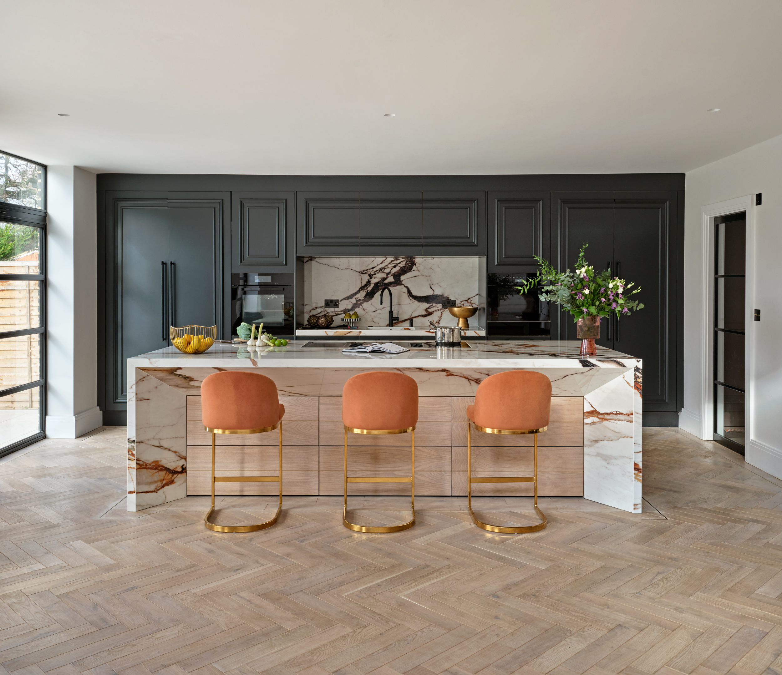 SHEROTON interiors 設計公司於英國SLOUGH規劃的一個廚房空間,運用XTONE流金歲月PAONAZZO BIONDO妝點壁櫃、流理檯面及廚房中島,在深色的櫃體及原木地板間,成為空間中目光的焦點,就讓我一同來欣賞SHEROTON INTERIORS精彩的設計吧!